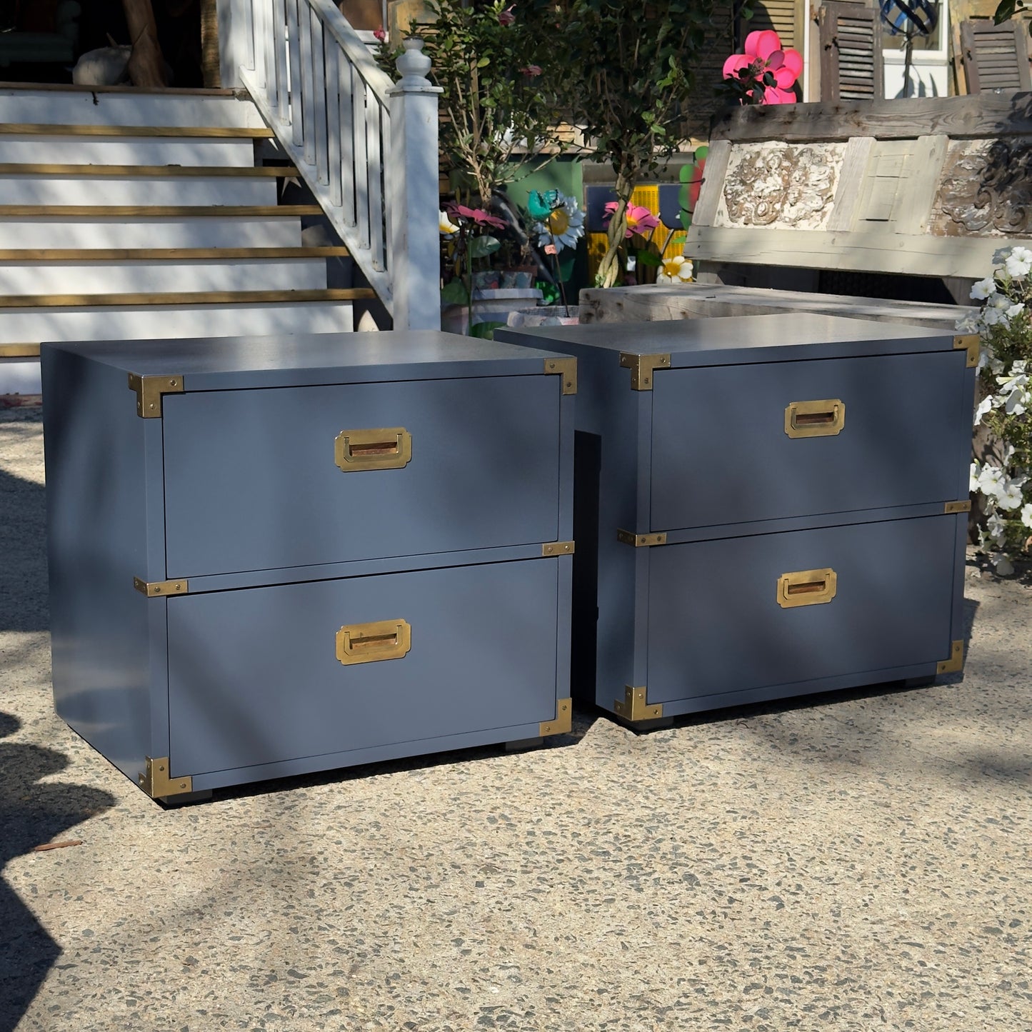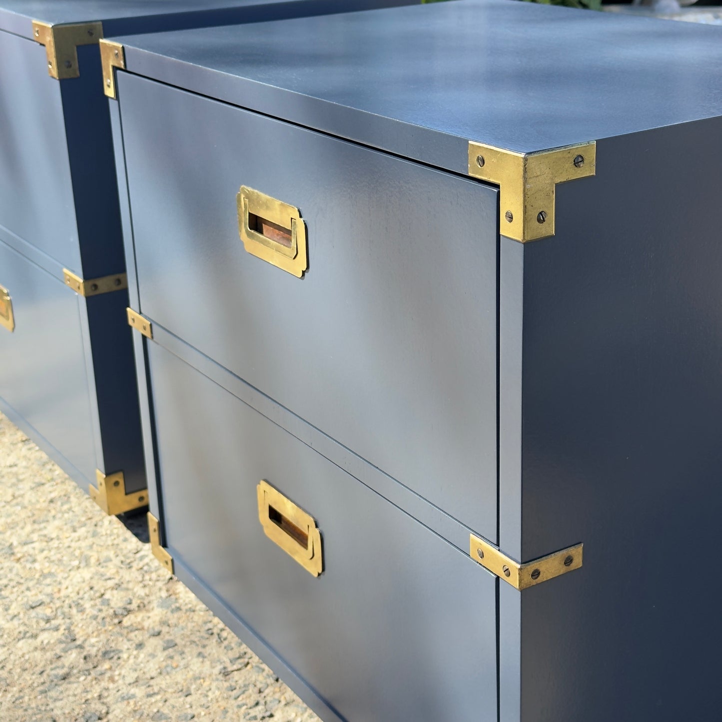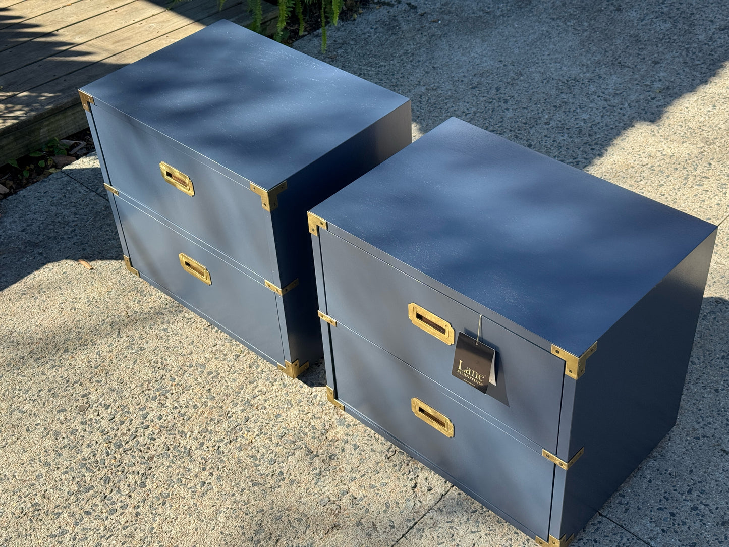 Say hello to this Pair of Lane Campaign Nightstands, lacquered in navy. Original Lane paperwork still attached, how fun! Refinished by @VintageRemedyShop