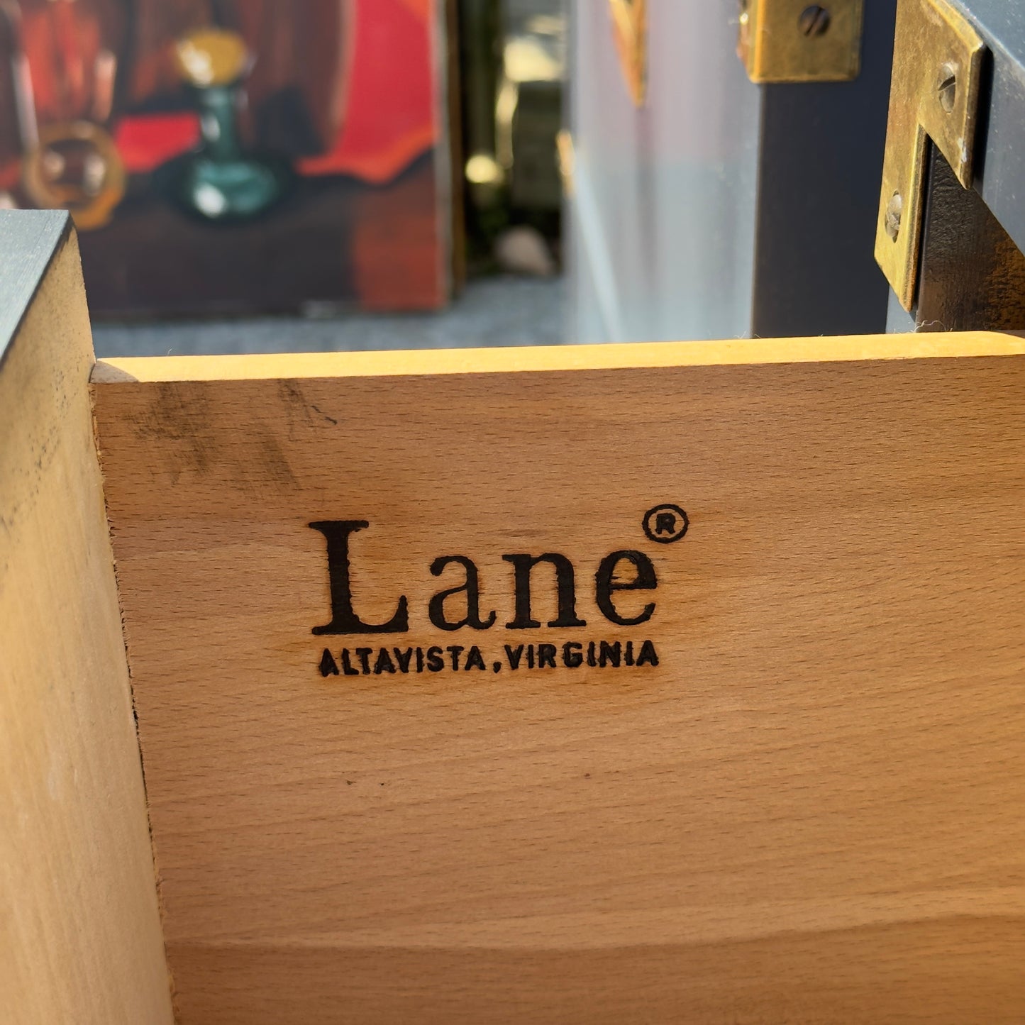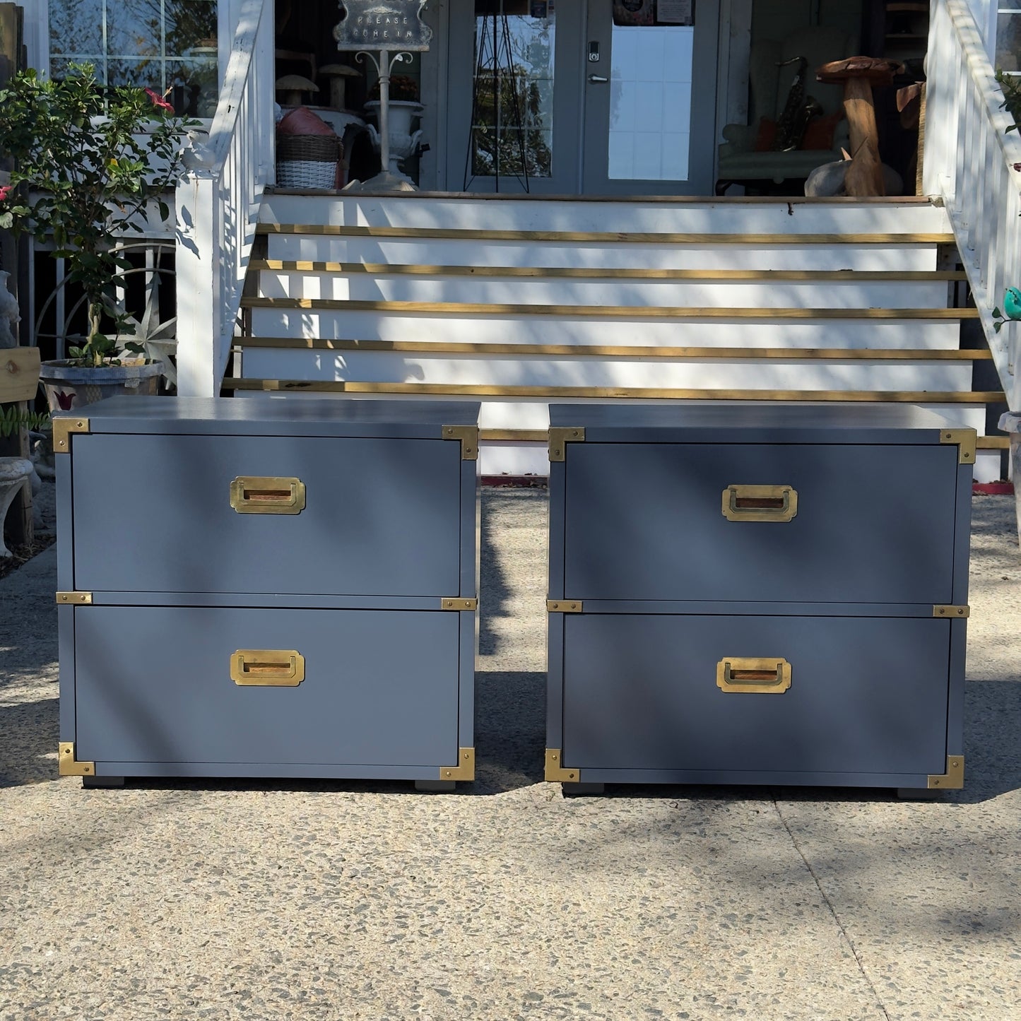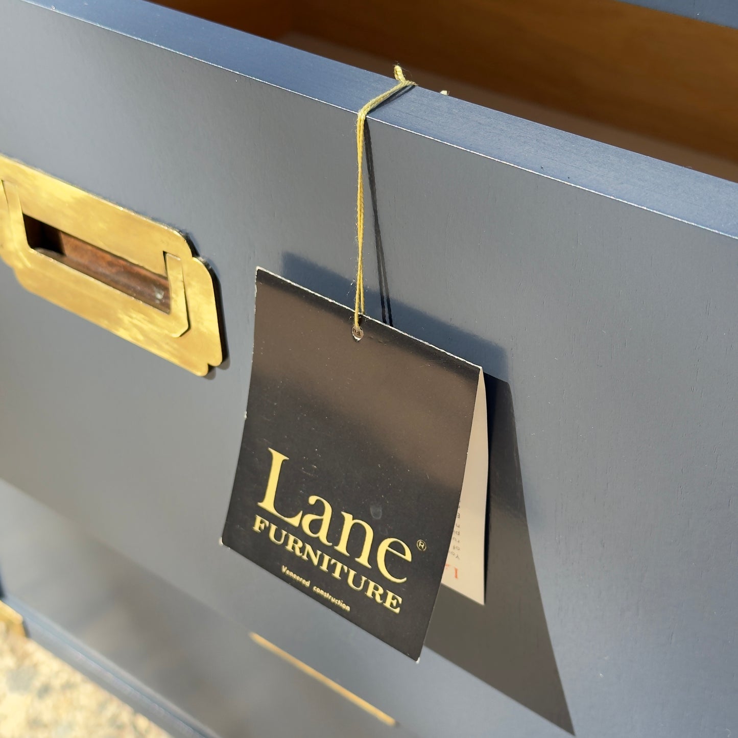 Say hello to this Pair of Lane Campaign Nightstands, lacquered in navy. Original Lane paperwork still attached, how fun! Refinished by @VintageRemedyShop