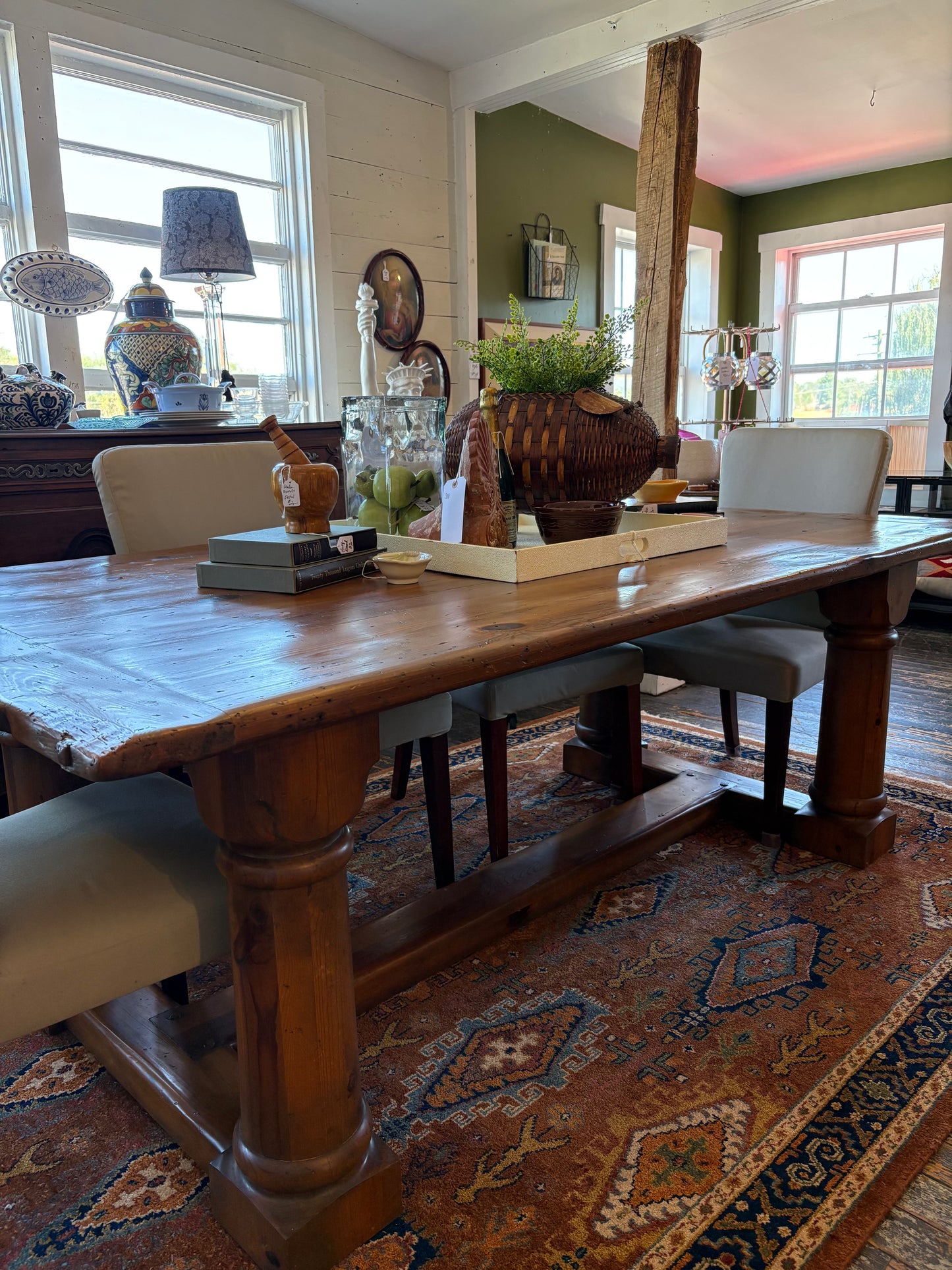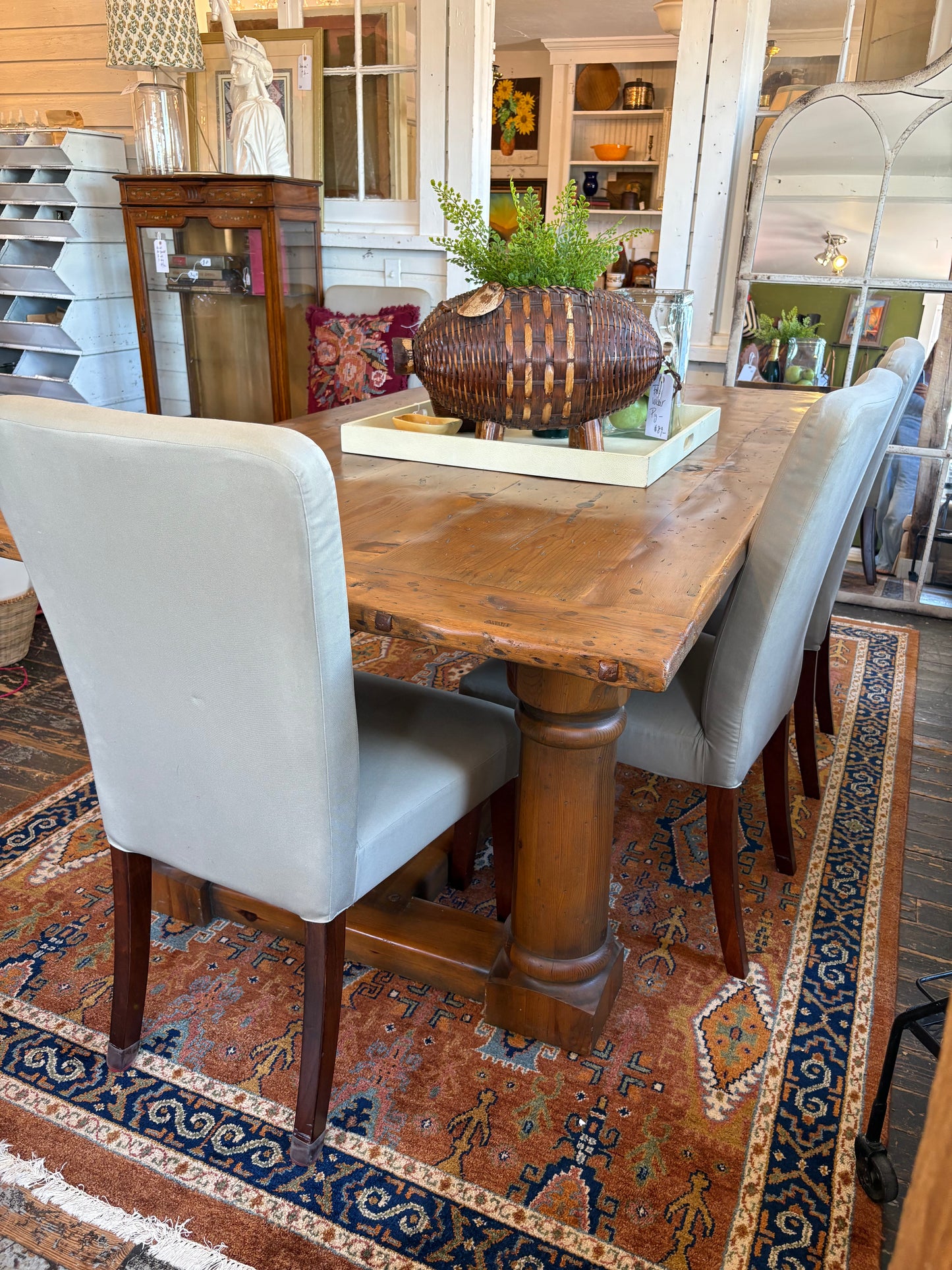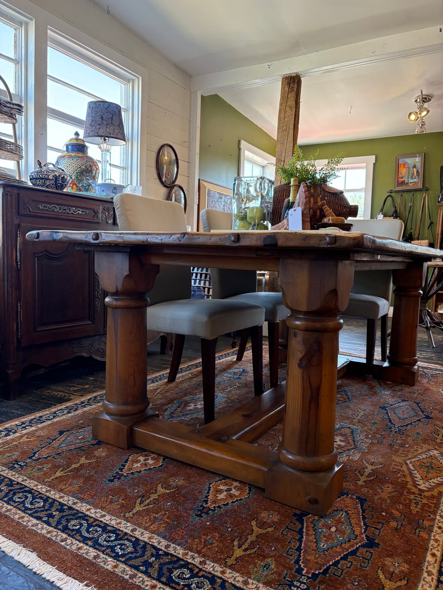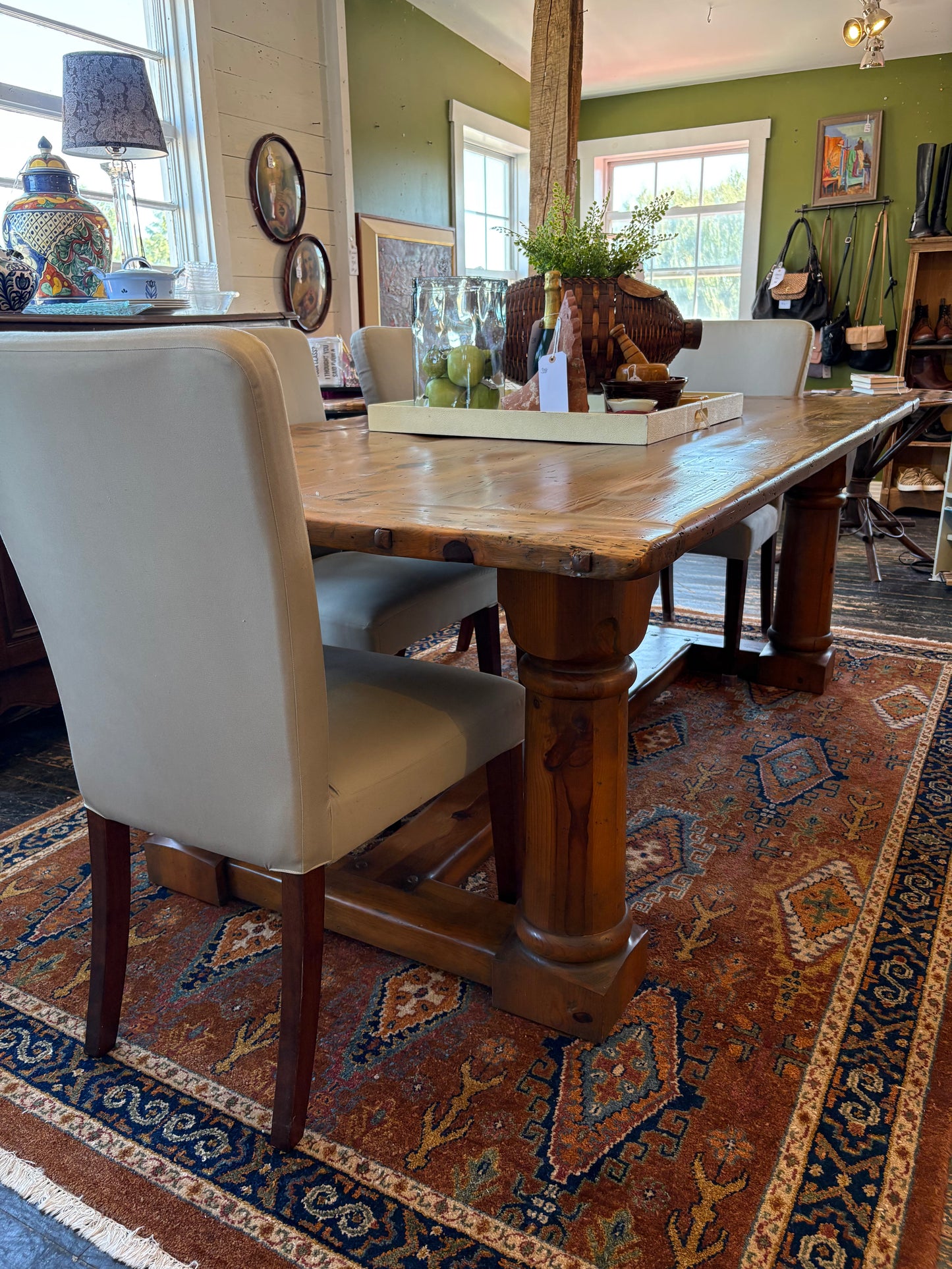Check out this amazing Pine trestle dining table designed by Ralph Lauren and manufactured by Henredon! Rustic plank top accented with breadboard ends with wood pegs. The trestle style bases consists of 4 large turned legs.