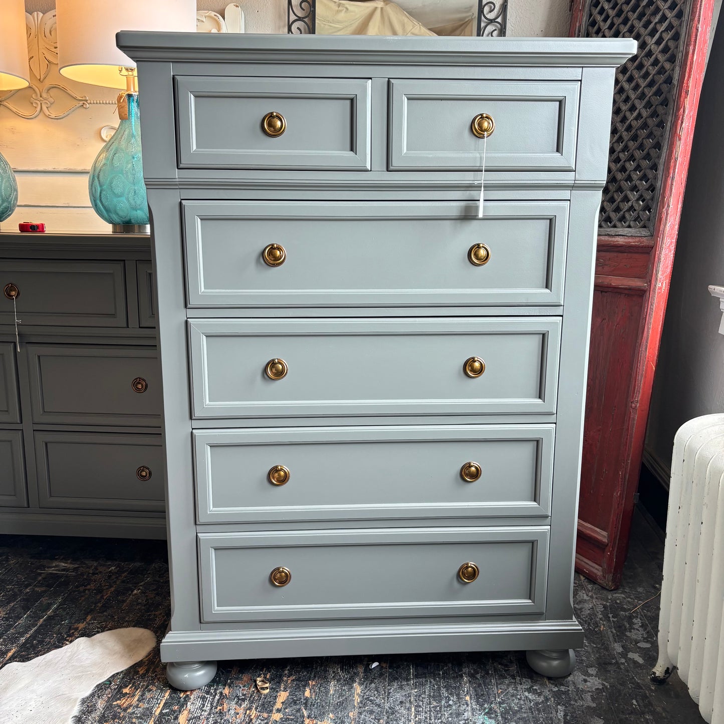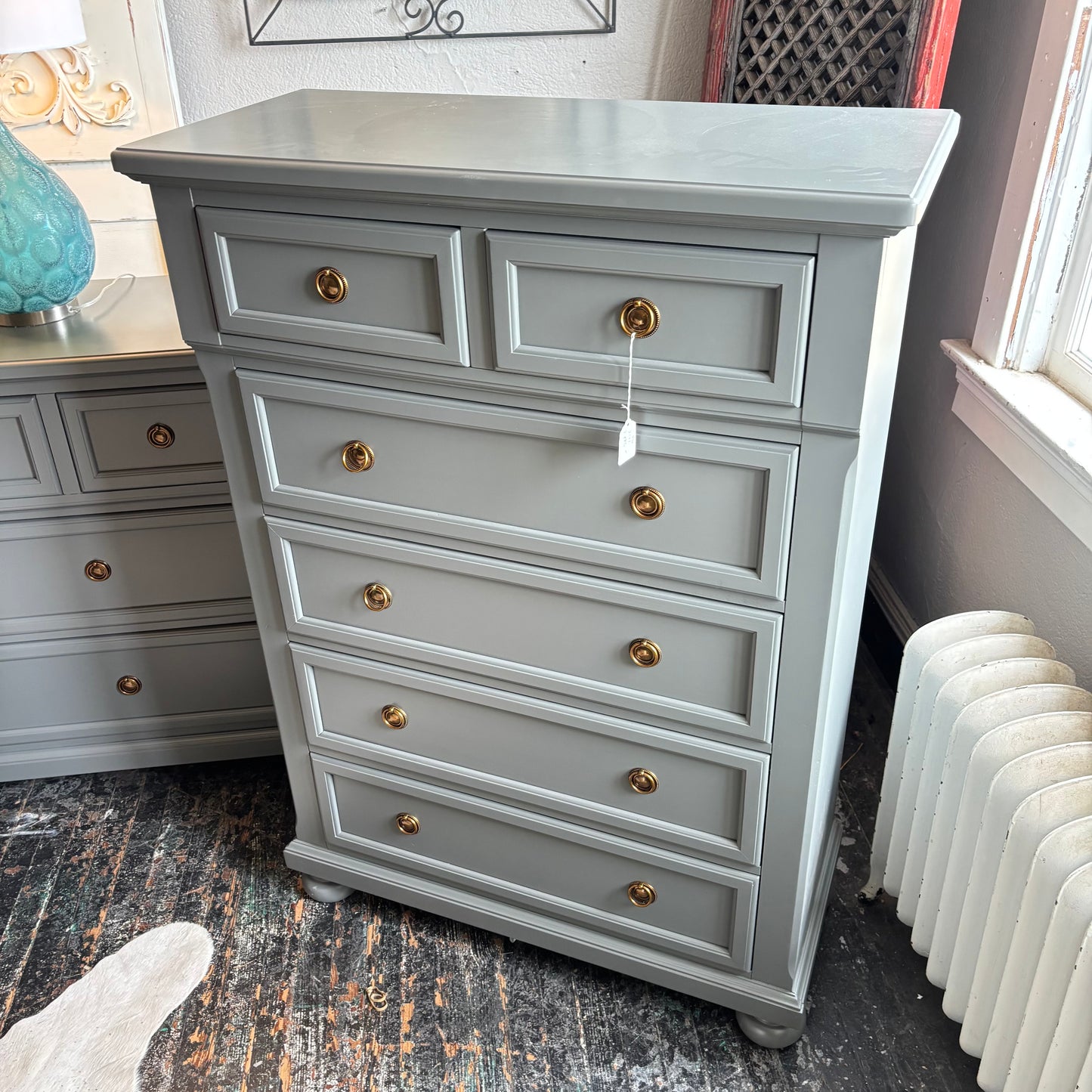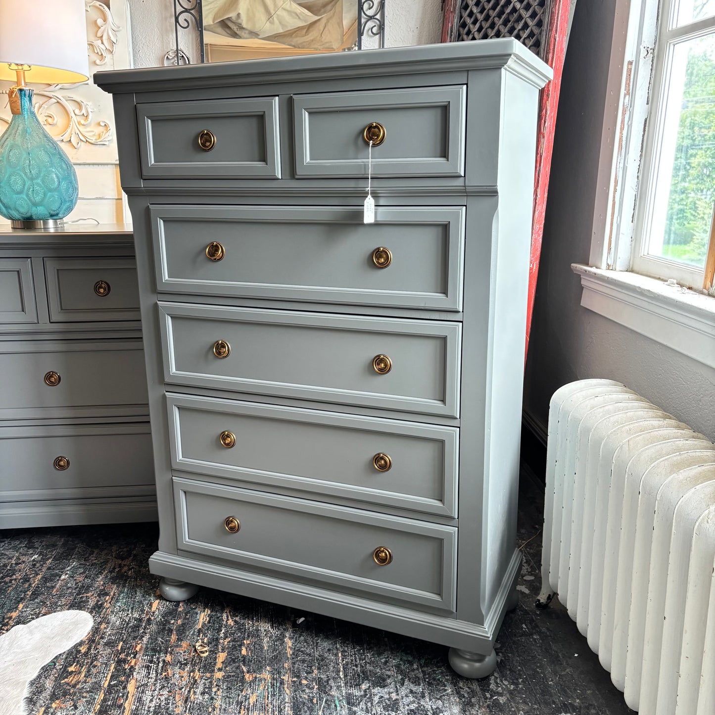 This modern gray highboy features six spacious drawers accented with classic brass pulls, blending style with function! Its tall, clean-lined design makes it perfect for maximizing storage while adding a modern stately vibe to any room!