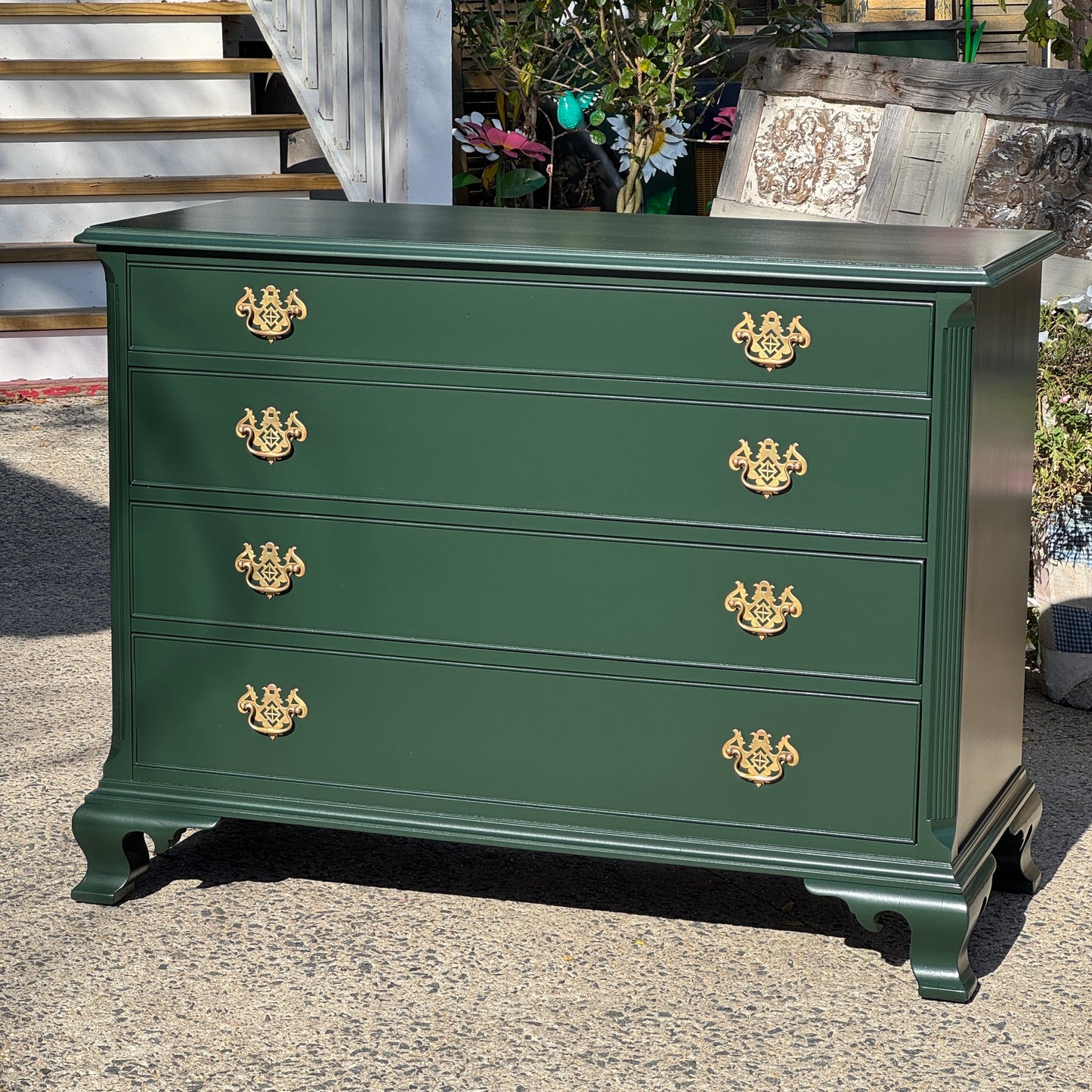 Freshly lacquered in one of our favorite shades of green. This mahogany chest was made by Berkey and Gay and is solid wood construction. Original brass hardware.