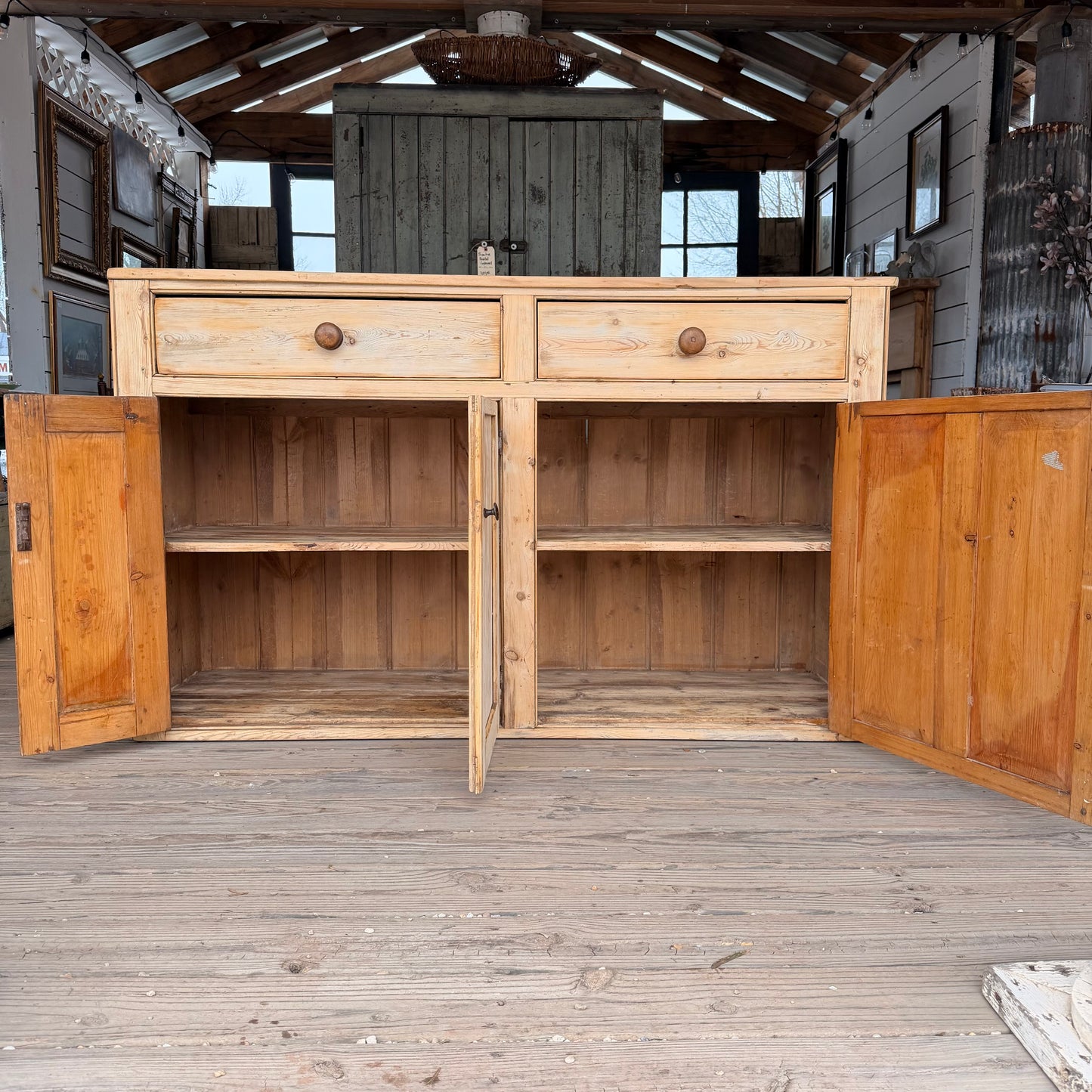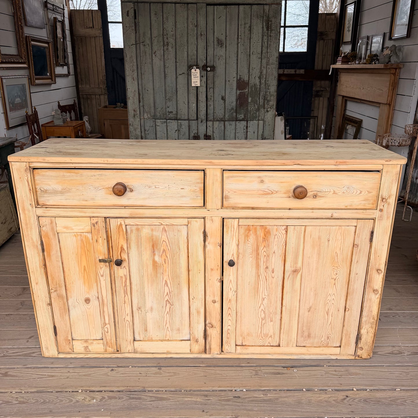 Crafted from solid pine with a beautifully timeworn finish, this sideboard features two spacious drawers over paneled cabinet doors for generous storage. Its simple lines, natural grain, and classic wood knobs give it an authentic farmhouse character that feels both warm and enduring.