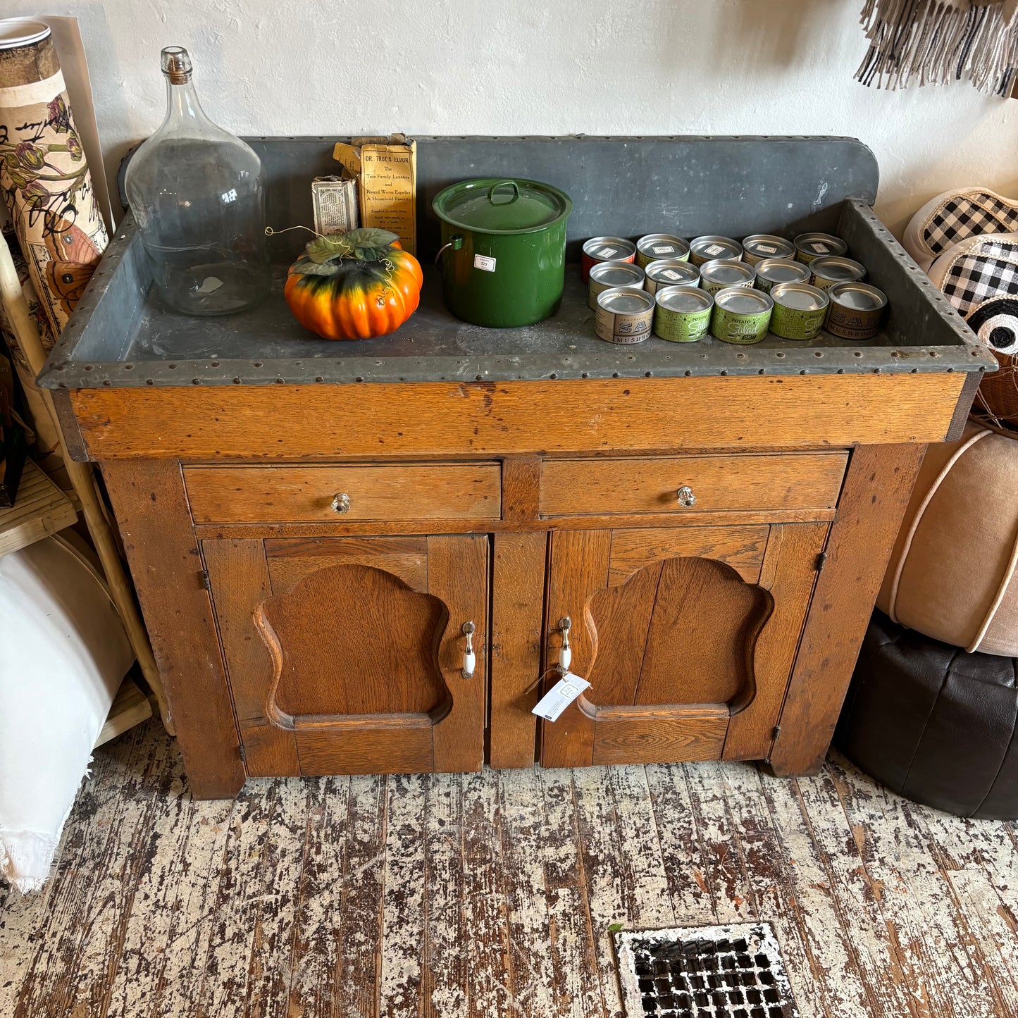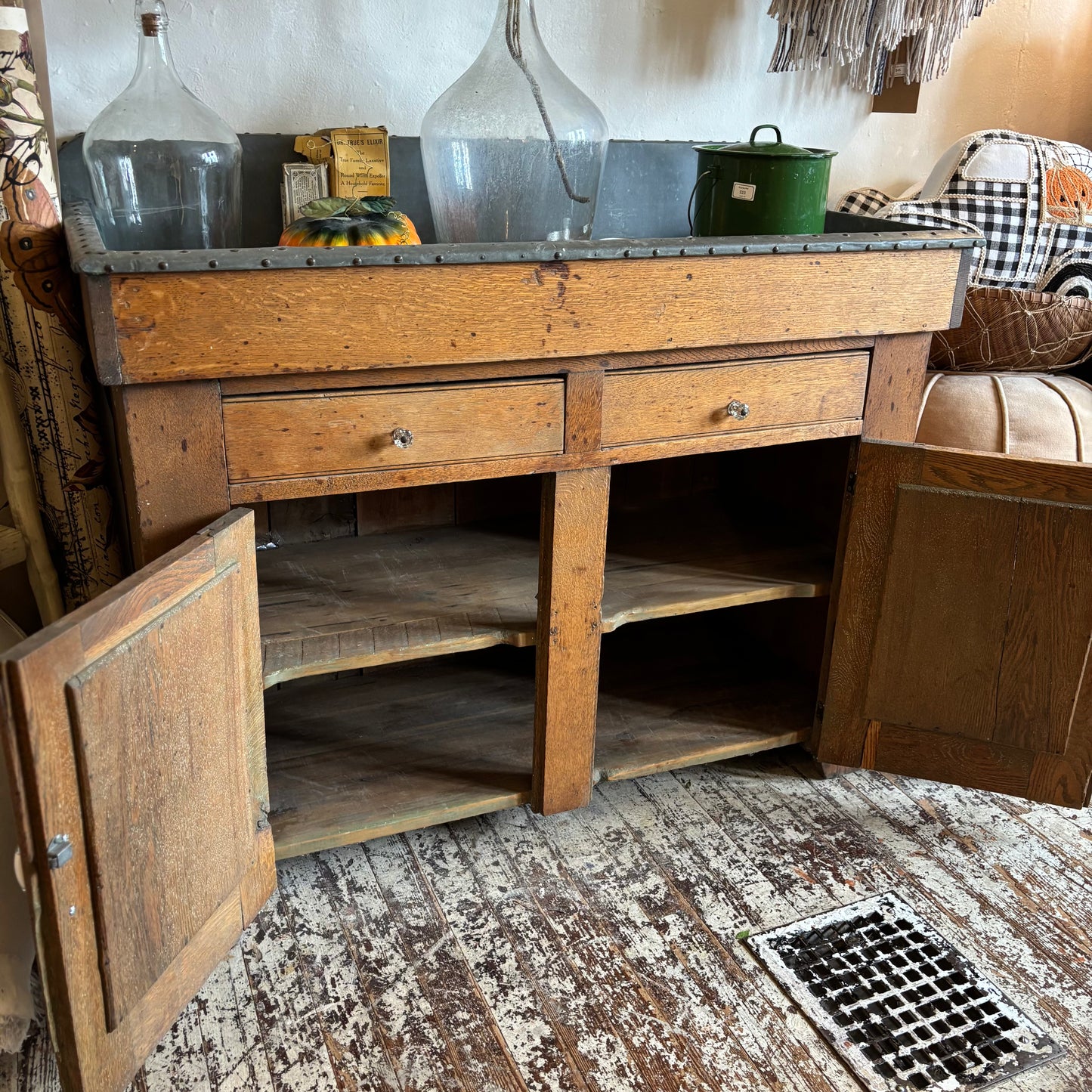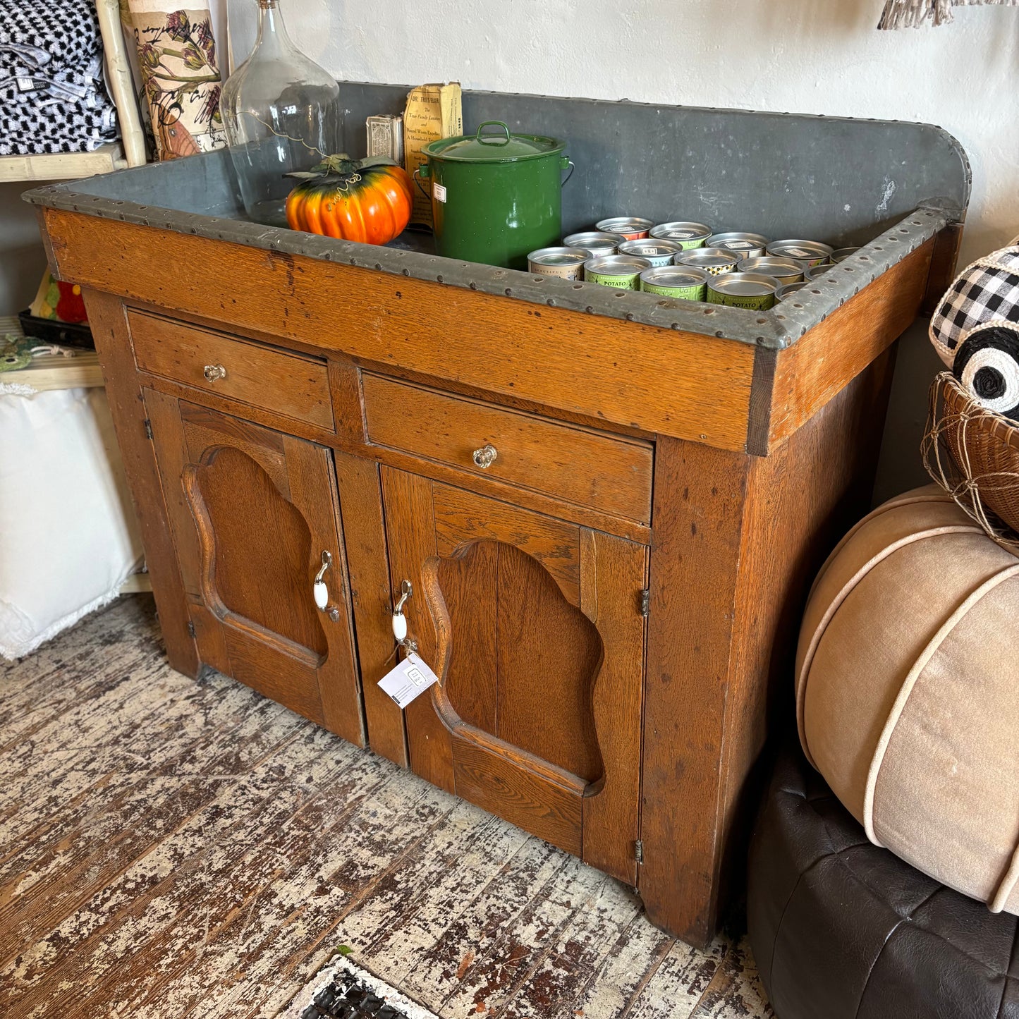This antique dry sink features a handsome oak frame with paneled doors and drawers, topped with a zinc-lined basin for a touch of utilitarian charm. Perfect as a statement piece in a kitchen, entryway, or garden room!