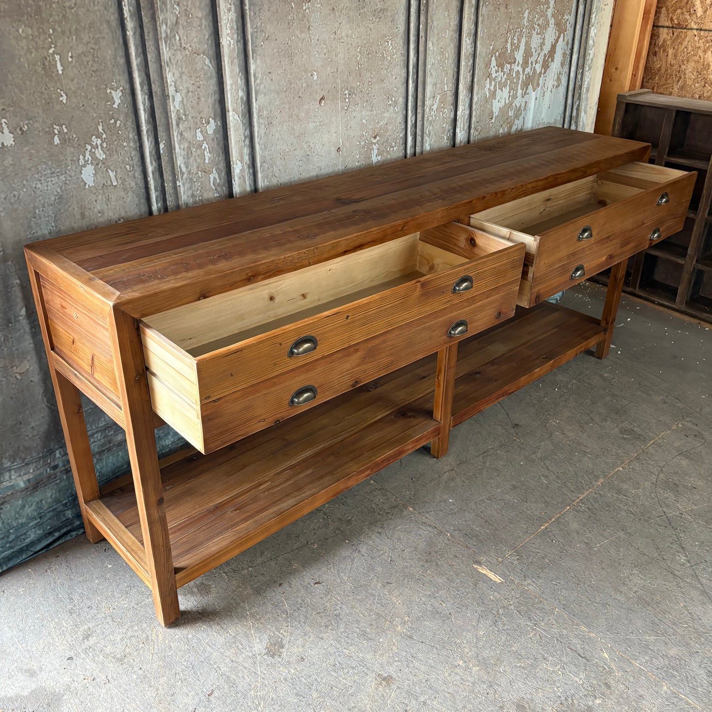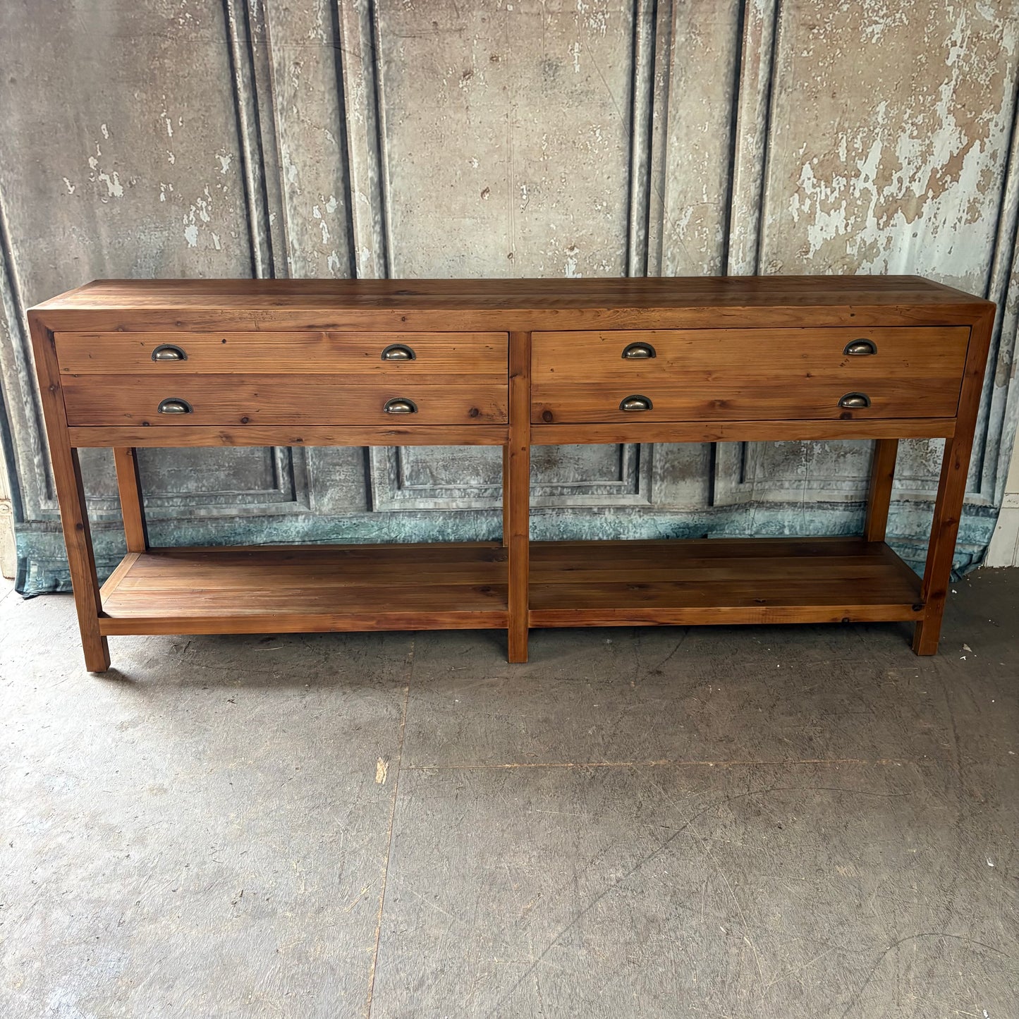 This lovely console table was crafted from solid pine and hit with a warm, brown finish. Its spacious design features a practical bottom shelf and two side-hung drawers for ample storage! A classic look that'll warm up any space!