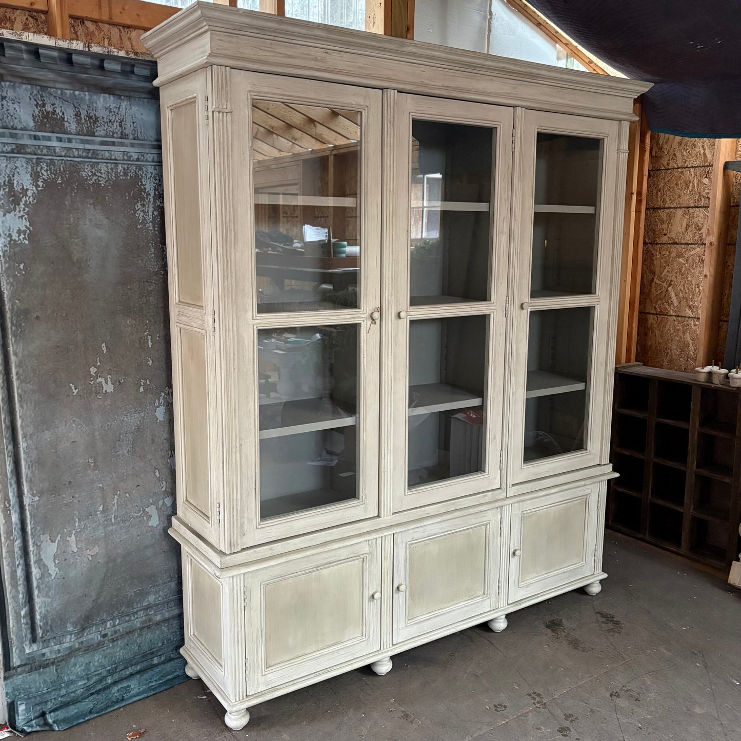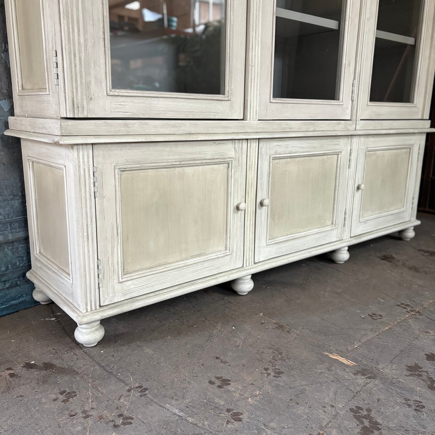 This display cabinet ain't messin' around! Featuring a gorgeous gray-wash finish, 3 glass paneled doors, and 3 smaller cabinets down below...it's guaranteed to make just about any wall disappear! It even breaks down into 4 separate pieces, so it shouldn't be a problem getting it where it needs to go!
