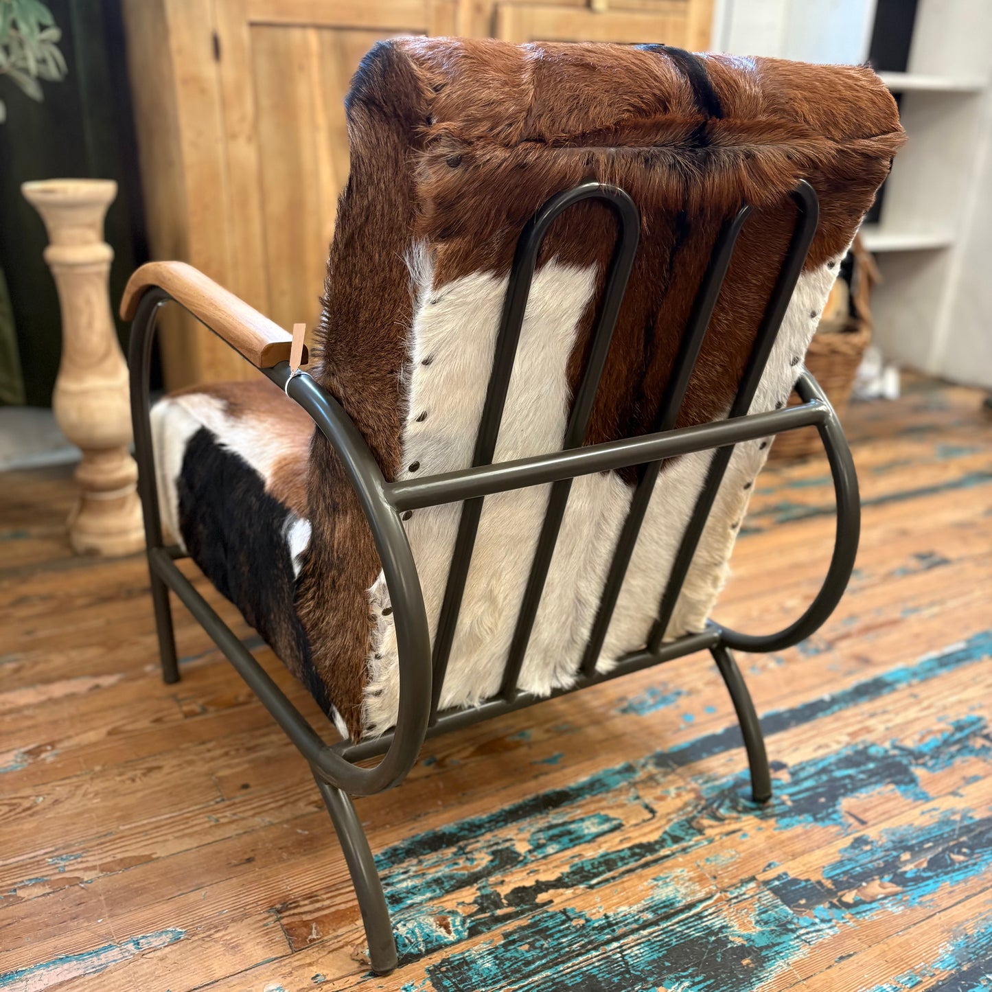 This here cowhide accent chair, with its sturdy metal legs and natural wood arms, is a true piece of frontier luxury. It'll make you feel like you're sittin' on a piece of the wild west, right in the heart of your own homestead!