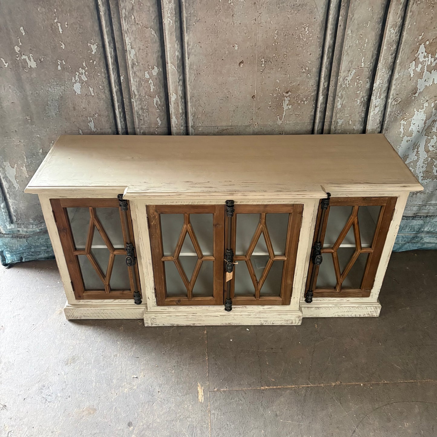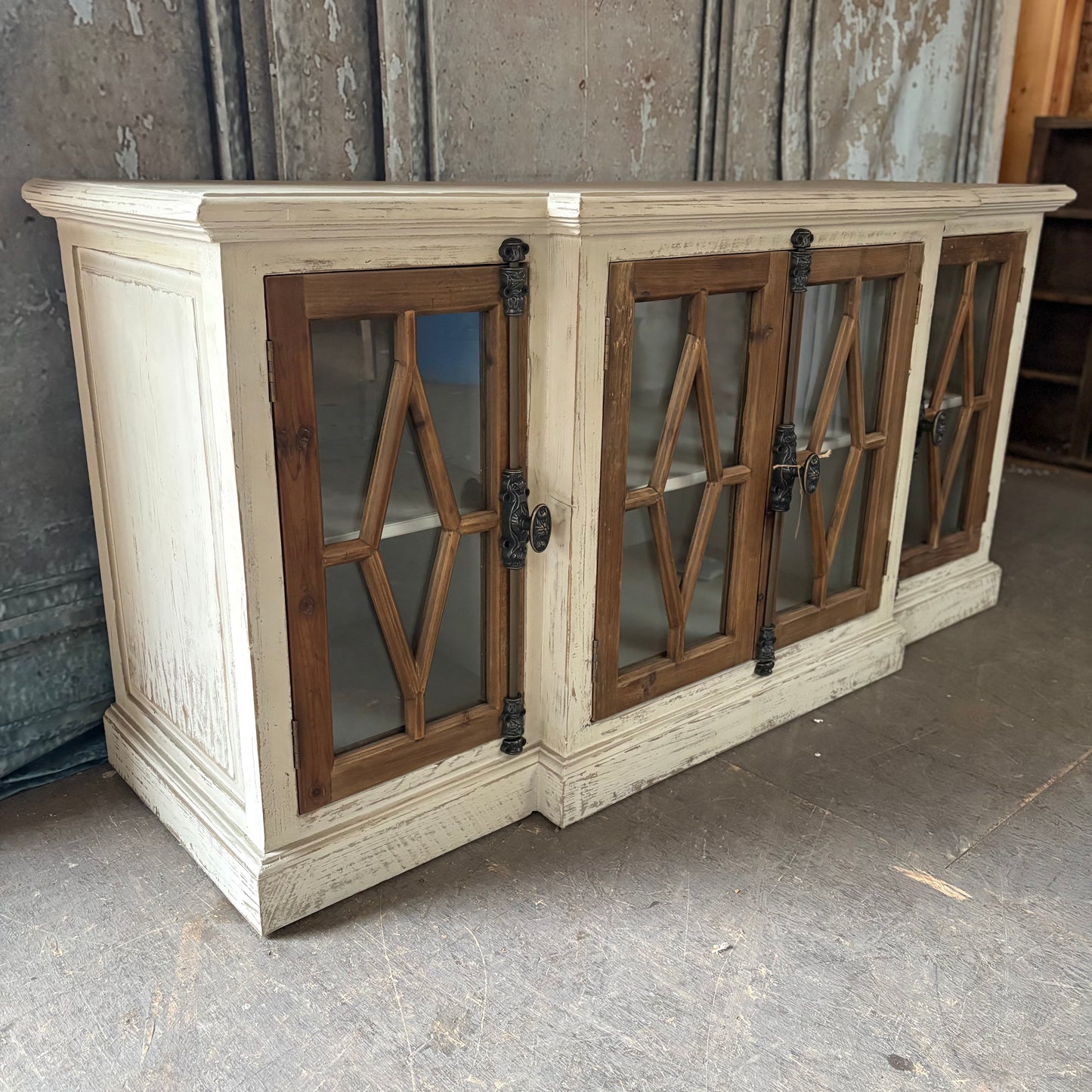 This gorgeous, rustic four-door cabinet has a delightfully distressed cream frame and warm wood-framed glass panels featuring diamond detailing. We love how the black iron hardware adds contrast and character to this charming farmhouse-style piece!