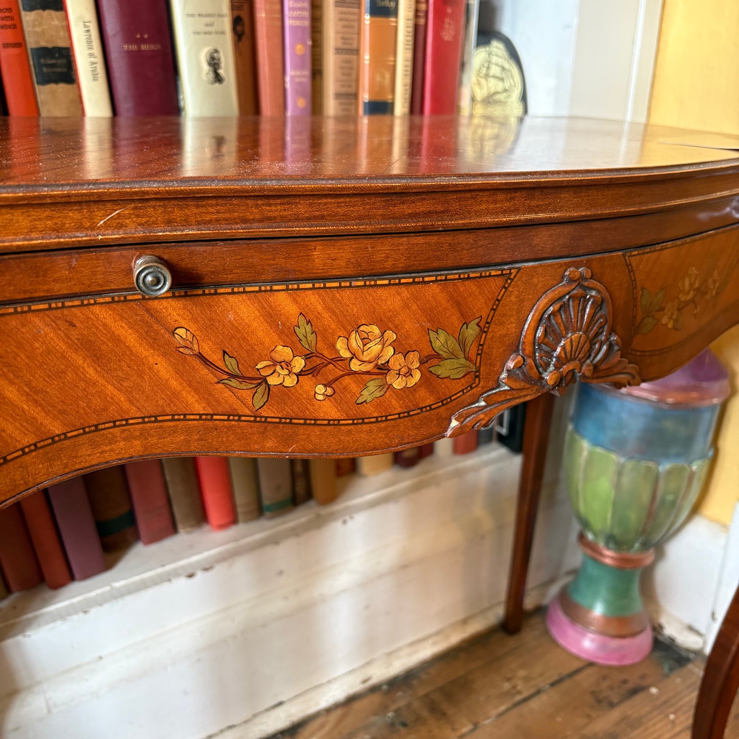 Lovely petite French writing desk with marquetry and a pull out surface! Check out all the pretty details!