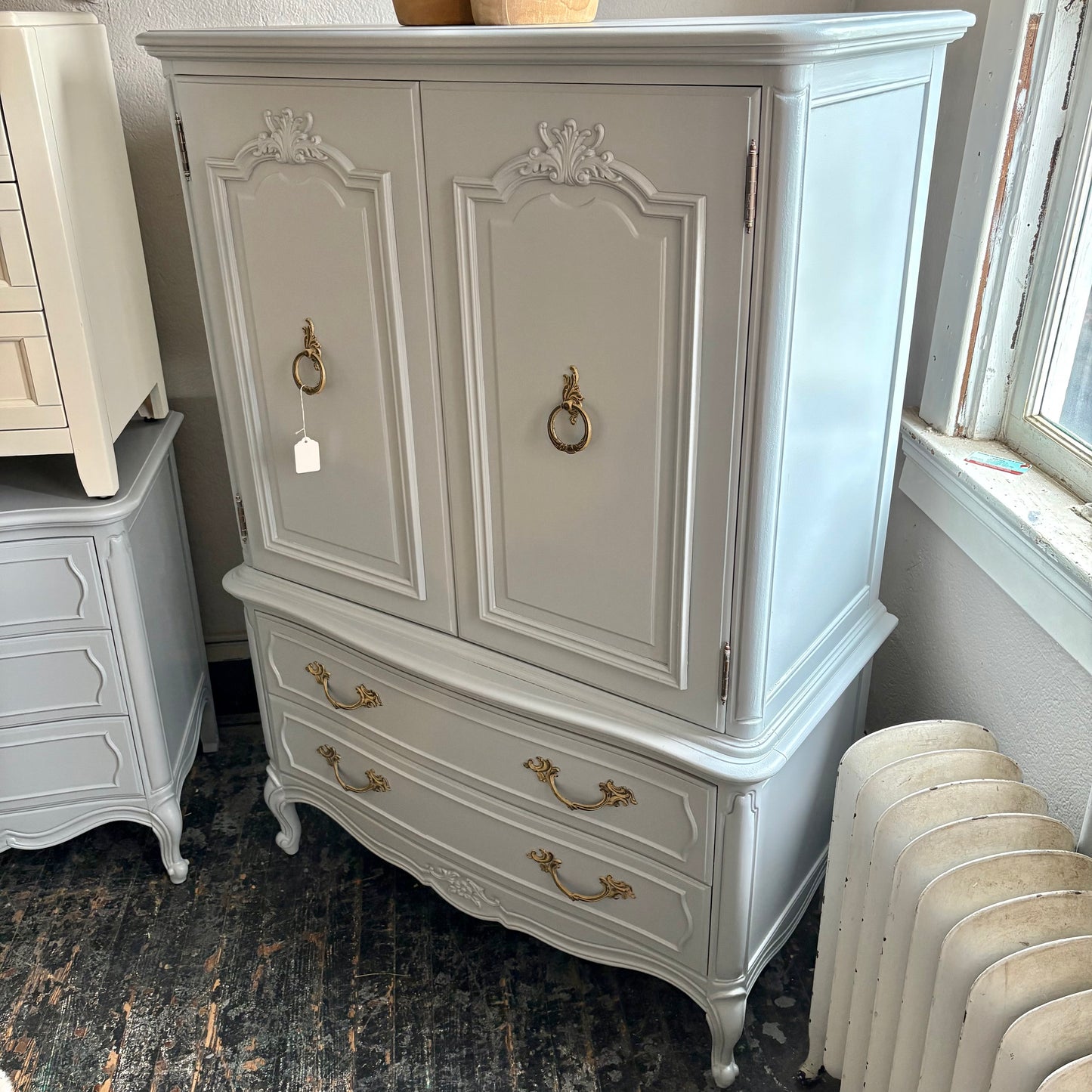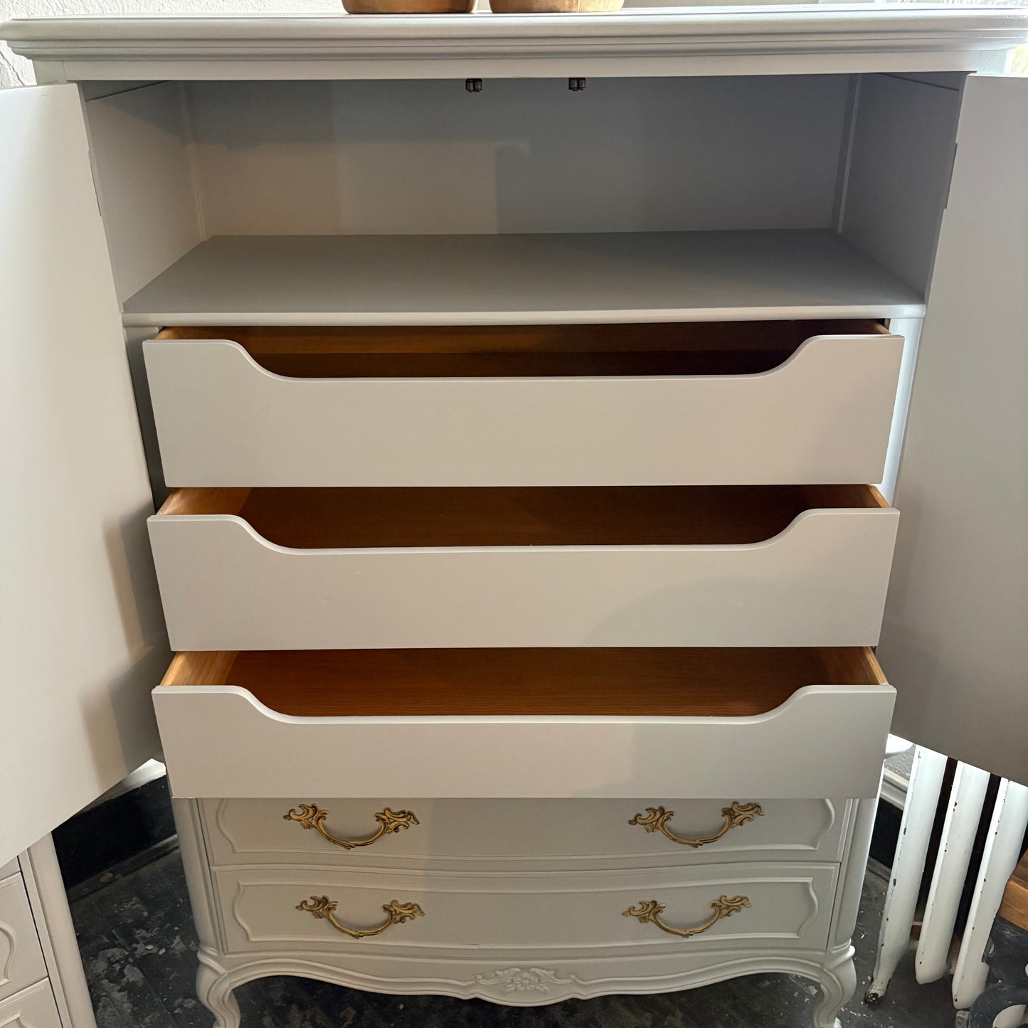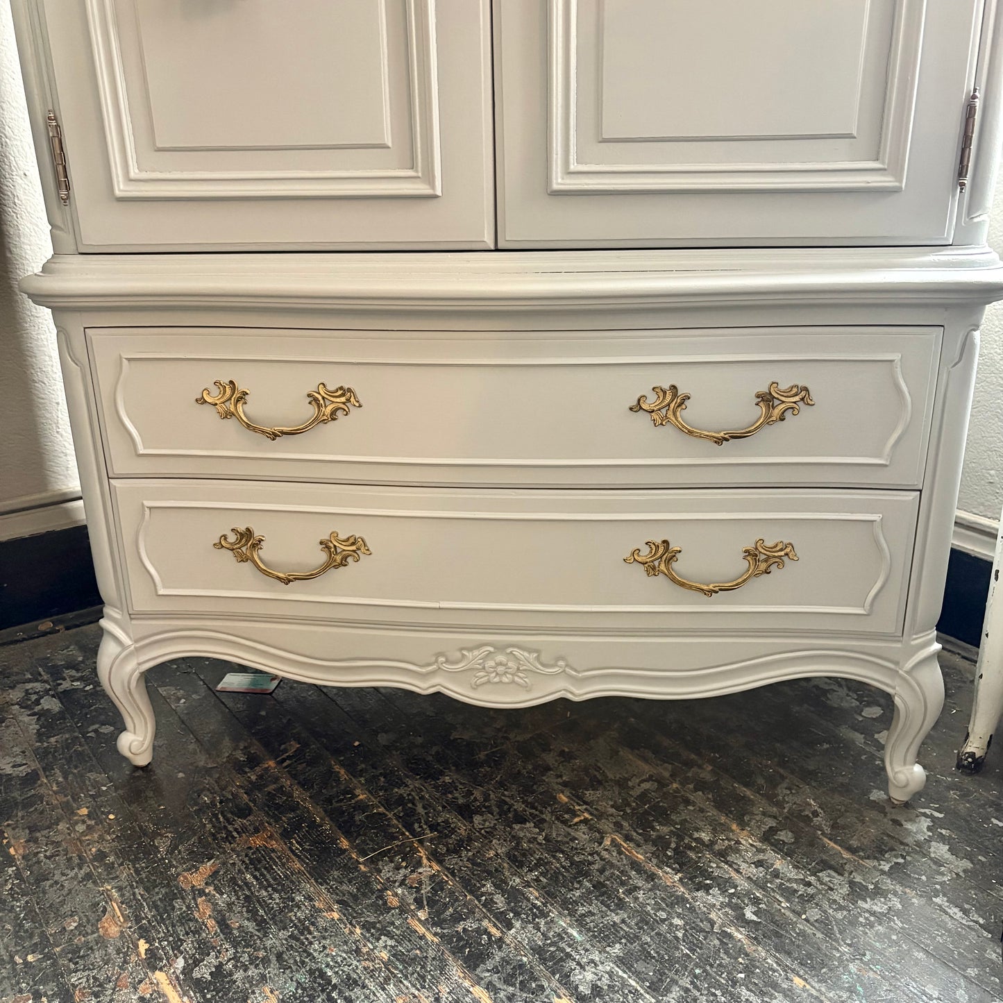 Is it an armoire? Is it a dresser? Only one thing is certain...it'sss fabulousss!!! With stunning ornate hardware, 5 drawers, and a little bit of cabinet space, this gal's not going to have any trouble finding a new home!