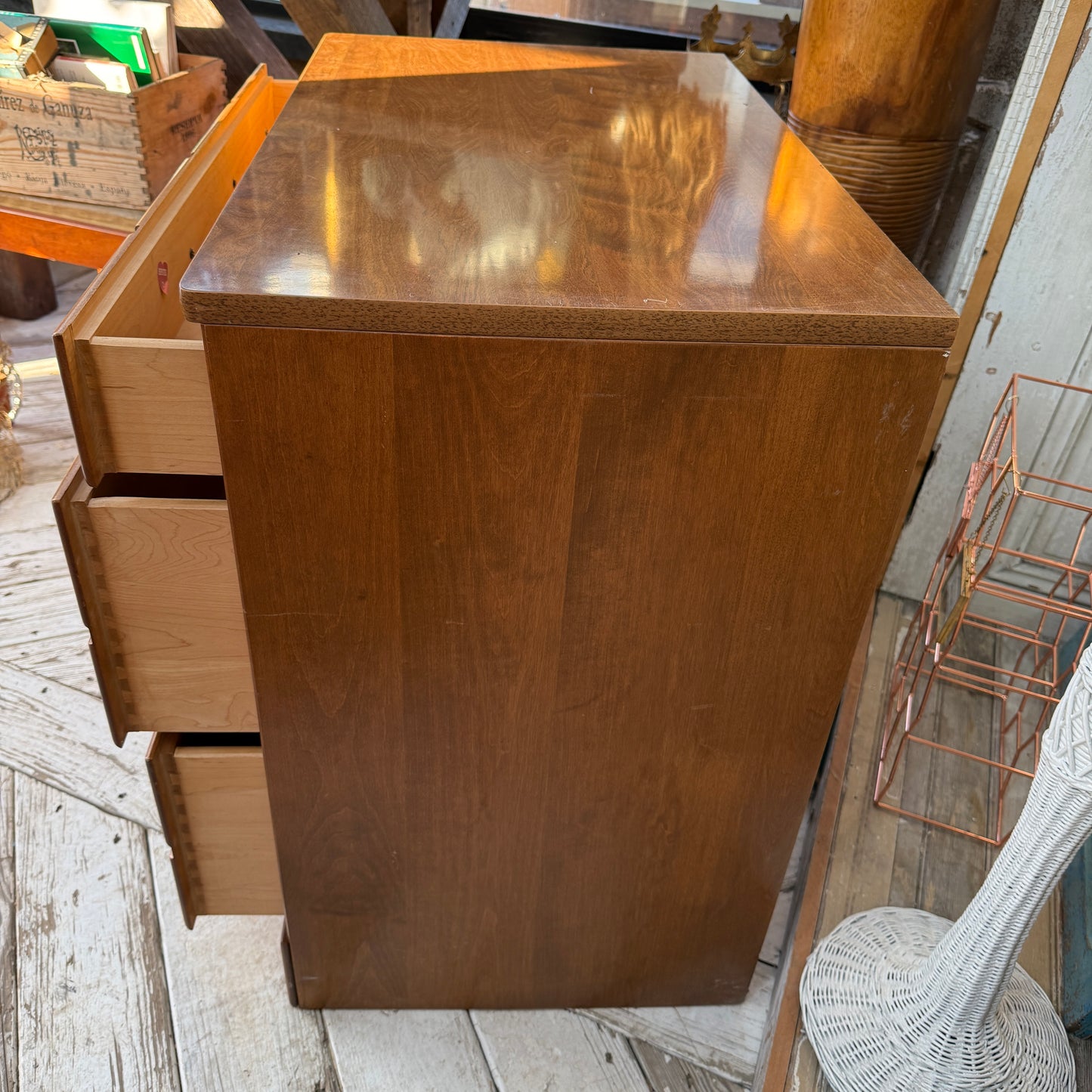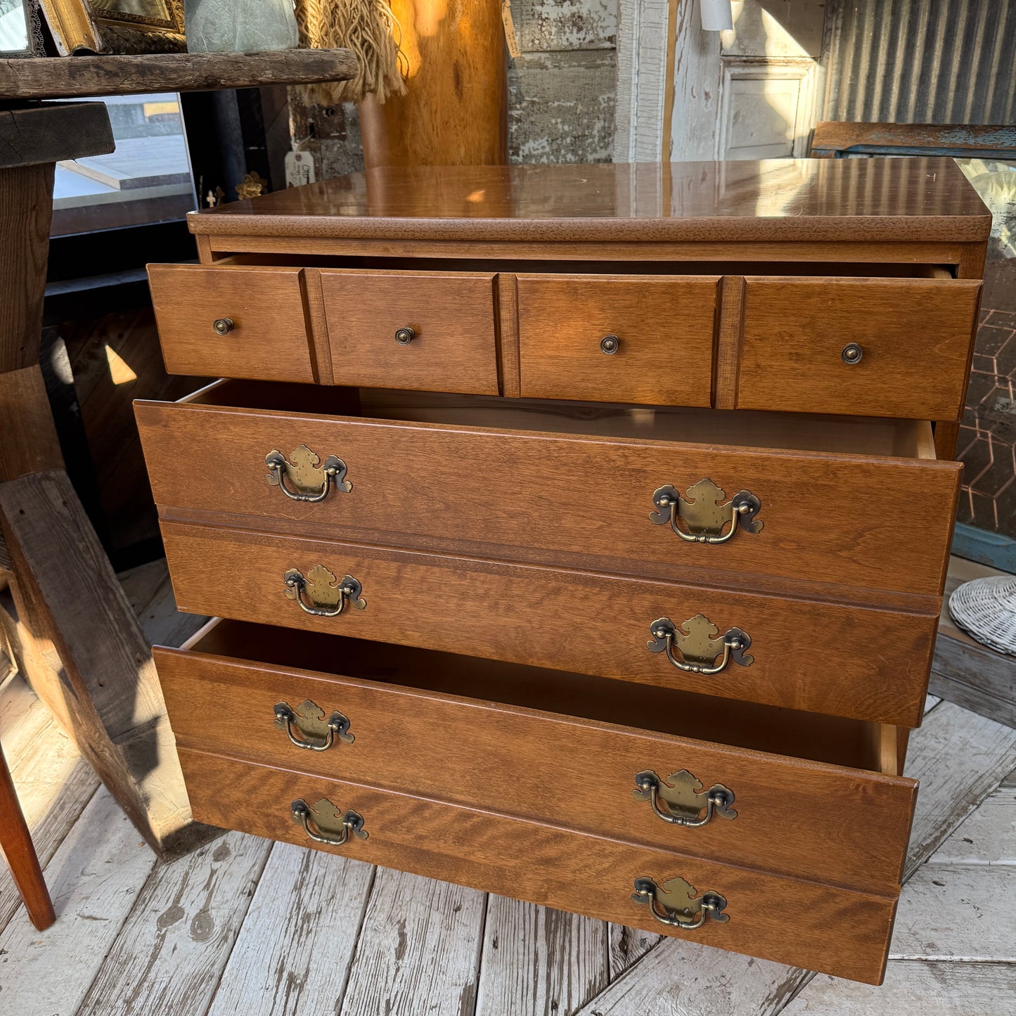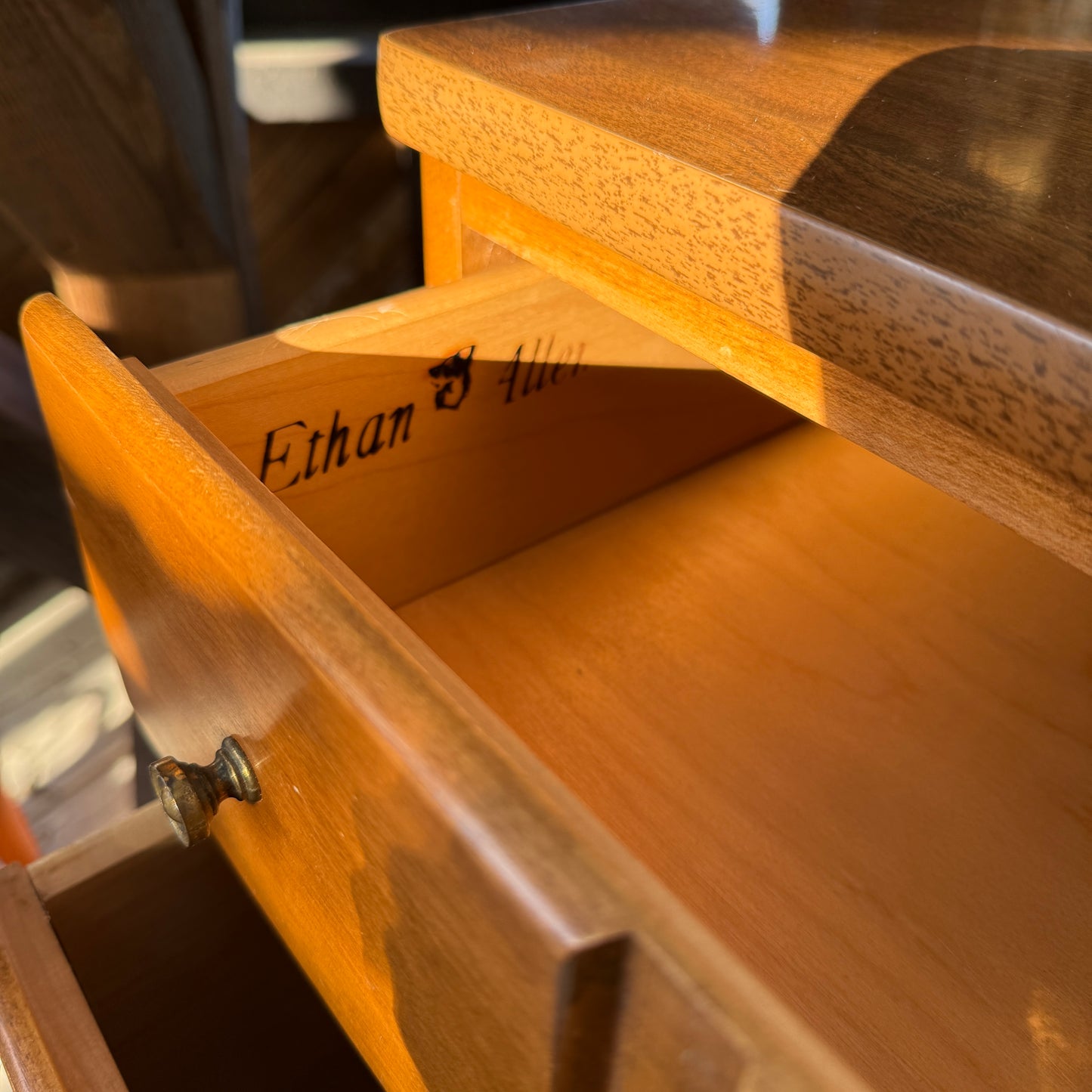 Classic Ethan Allen dresser with warm wood tones and timeless brass hardware, offering a clean, versatile look that has just the right amount of character!