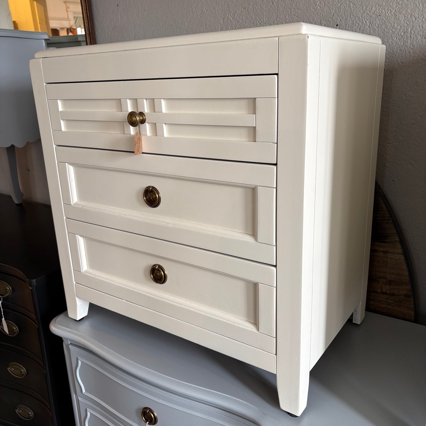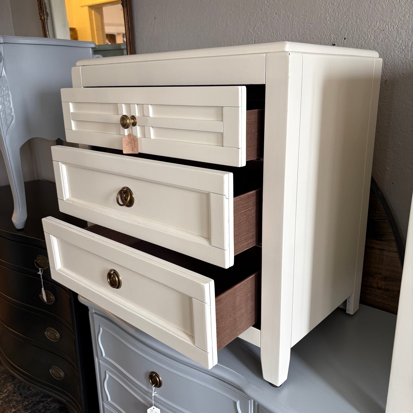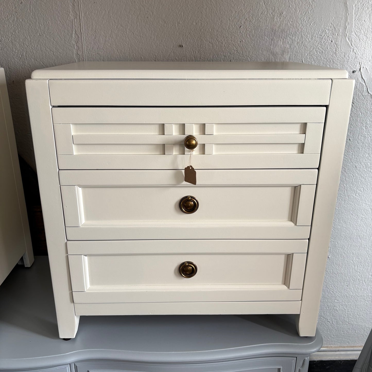 These chunky cream nightstands have 3 drawers each and pretty brass pulls that contrast nicely with the cream finish!