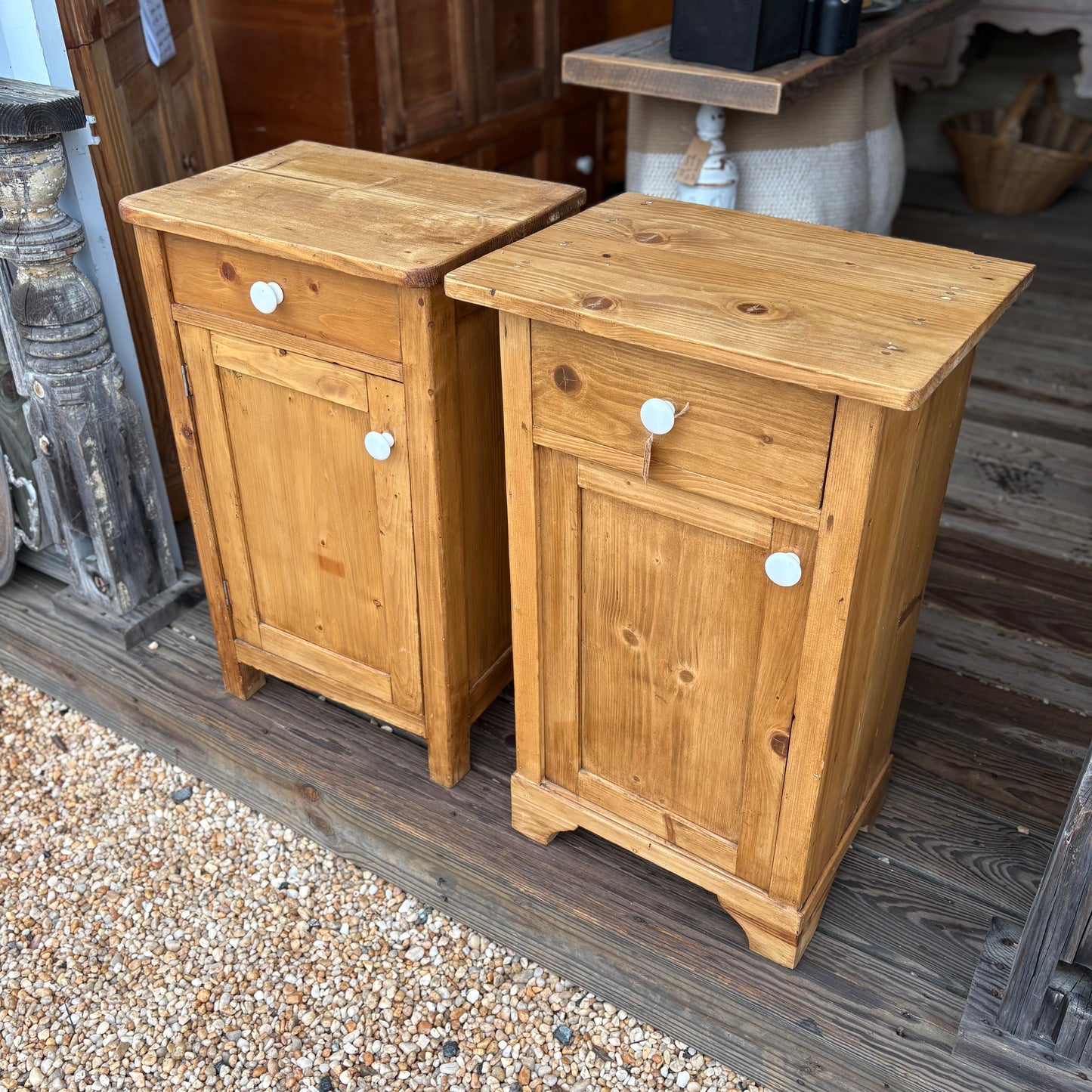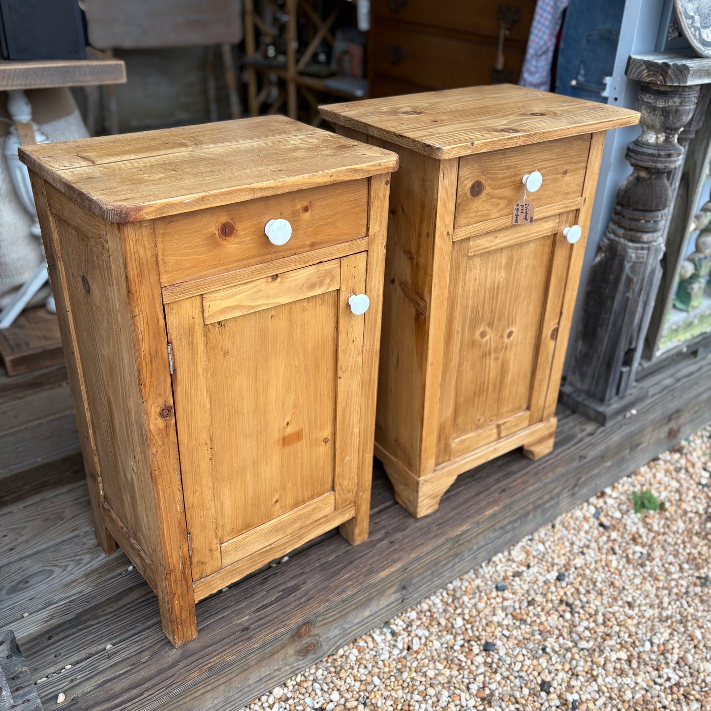 Cute pair of vintage pine nightstands with original porcelain knobs! These guys are almosttt twins but they're not identical!
