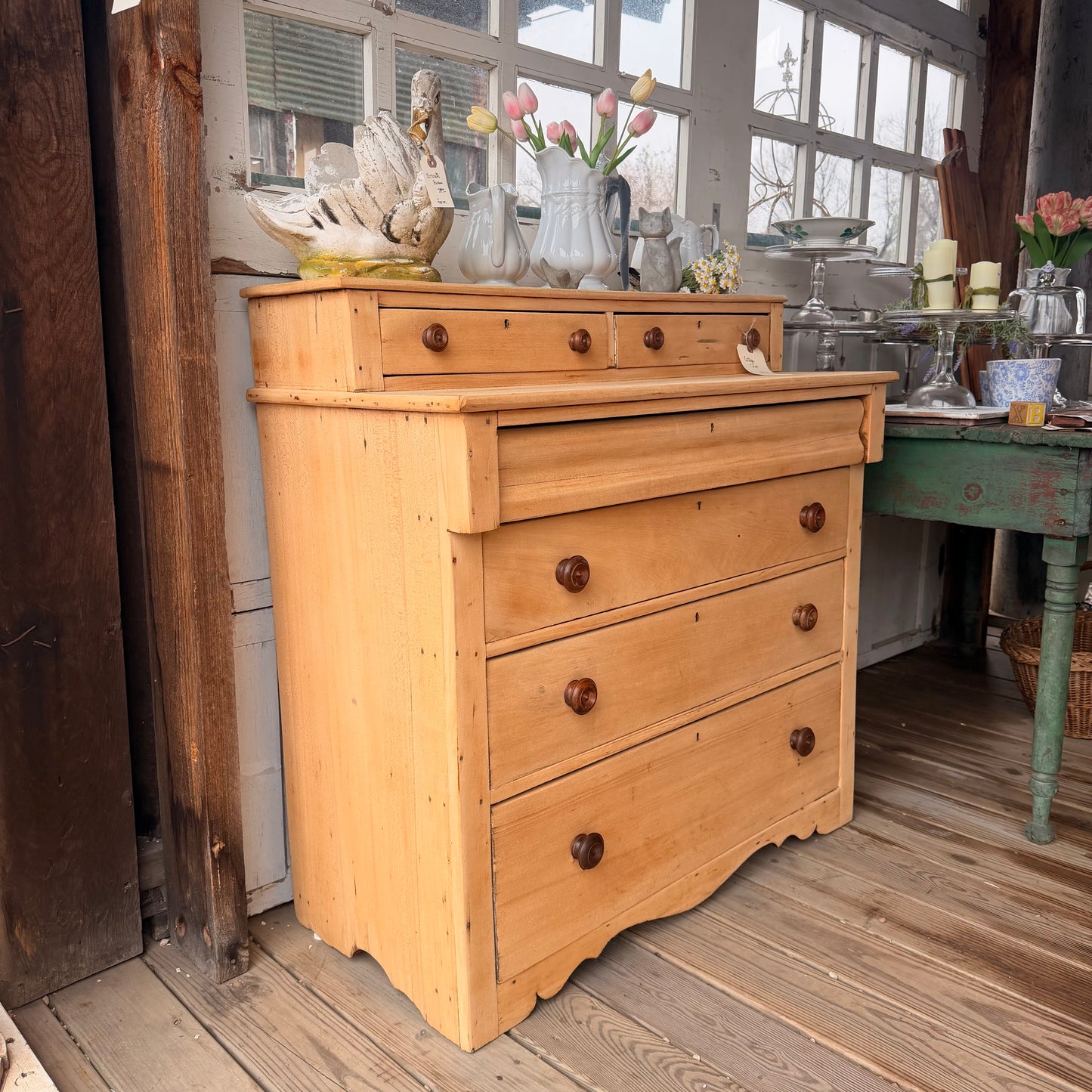 This charming antique pine dresser features warm natural wood tones, classic round wooden knobs, and a timeless farmhouse silhouette. The gallery top with two small drawers adds both character and extra storage, while the four spacious lower drawers provide practical organization with rustic appeal.