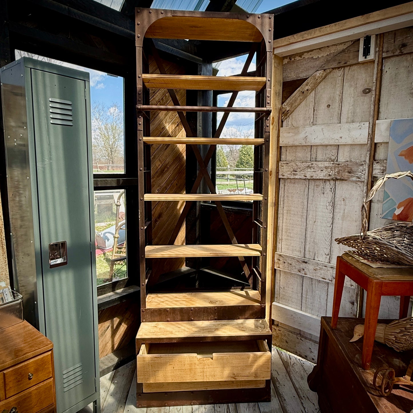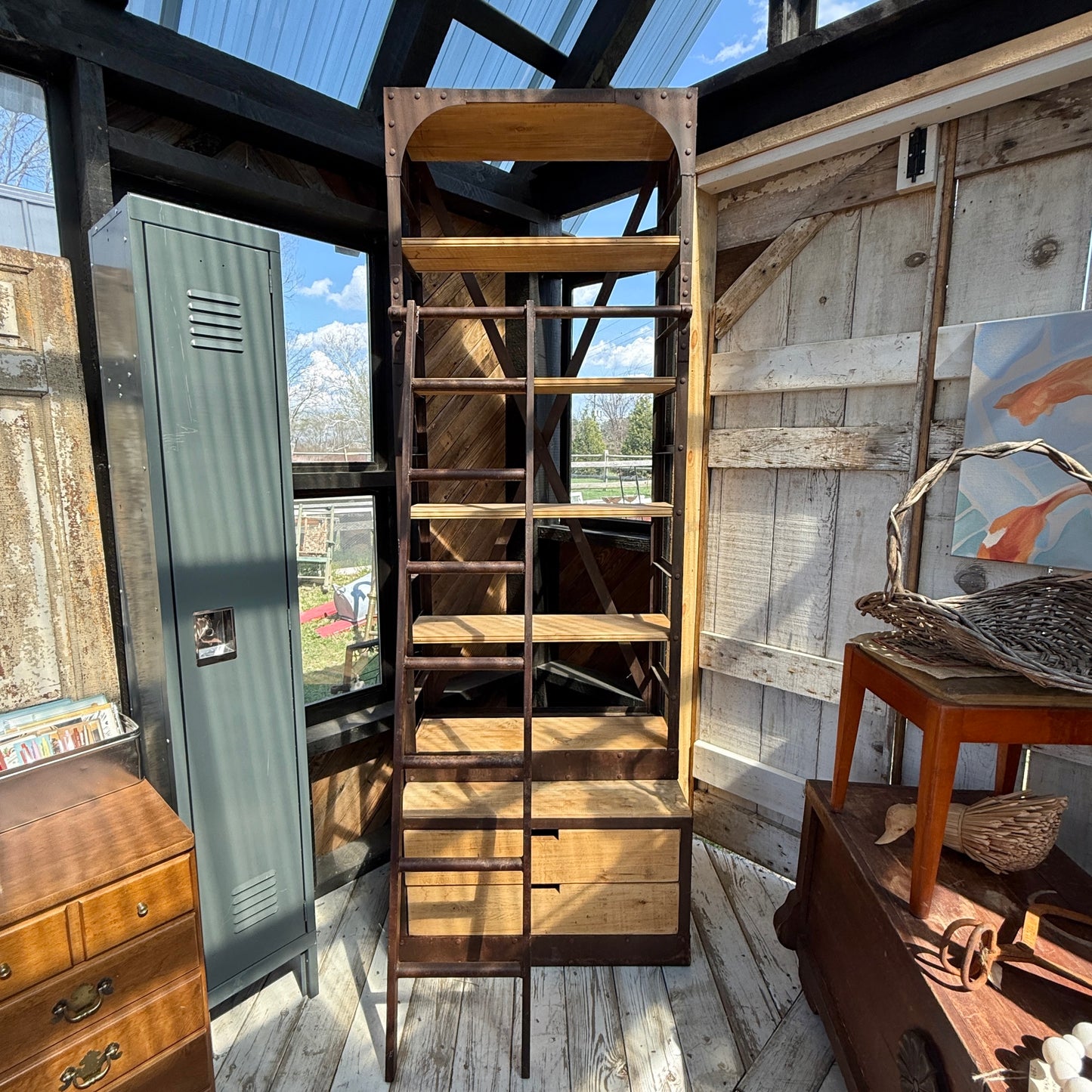 This amazing 3 piece Restoration Hardware tower shelf is comprised of a sturdy iron frame, mango wood shelves, two storage drawers, a ladder, and a style that just won't quit!!!
