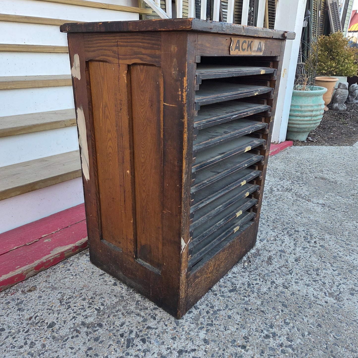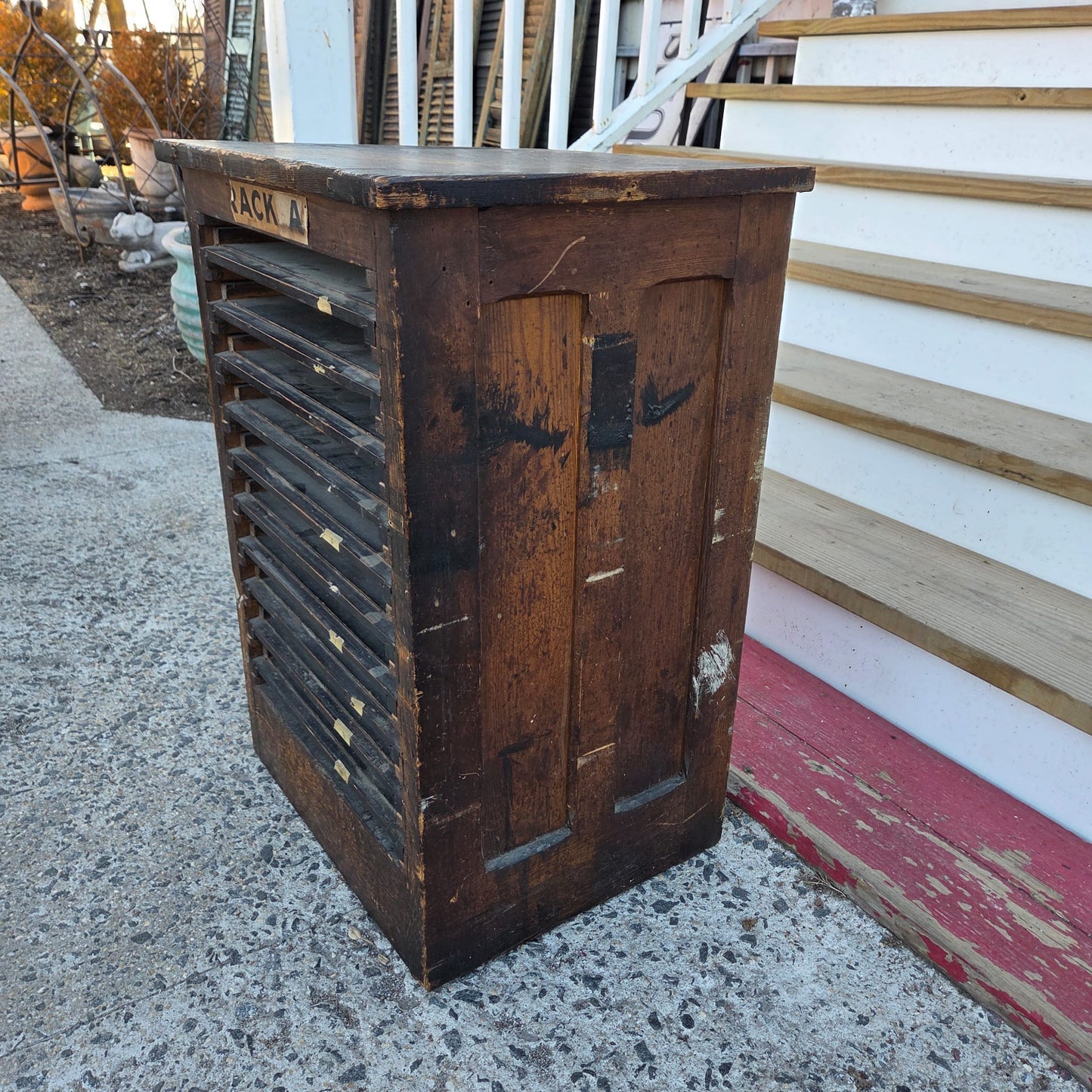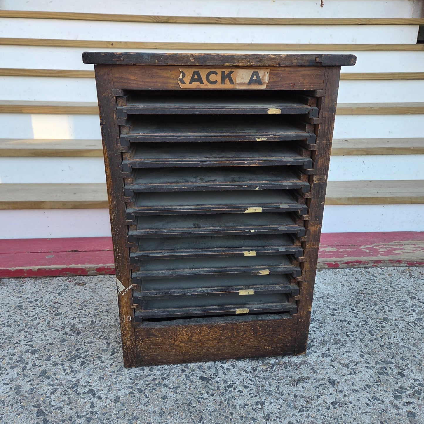 A rare find straight from an American print shop. This solid wood galley rack — labeled “Rack A” — retains all 12 original sliding trays, deep ink patina, and a worn label that reads like a design detail in itself.The flat top, paneled side, and dark-stained hardwood give it an effortlessly industrial presence. Use the trays as-is for art prints, maps, or blueprints — or style the open face as a display piece!