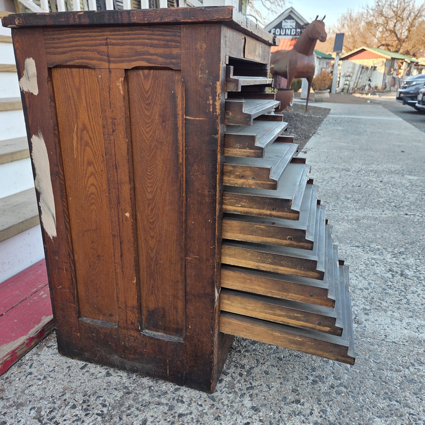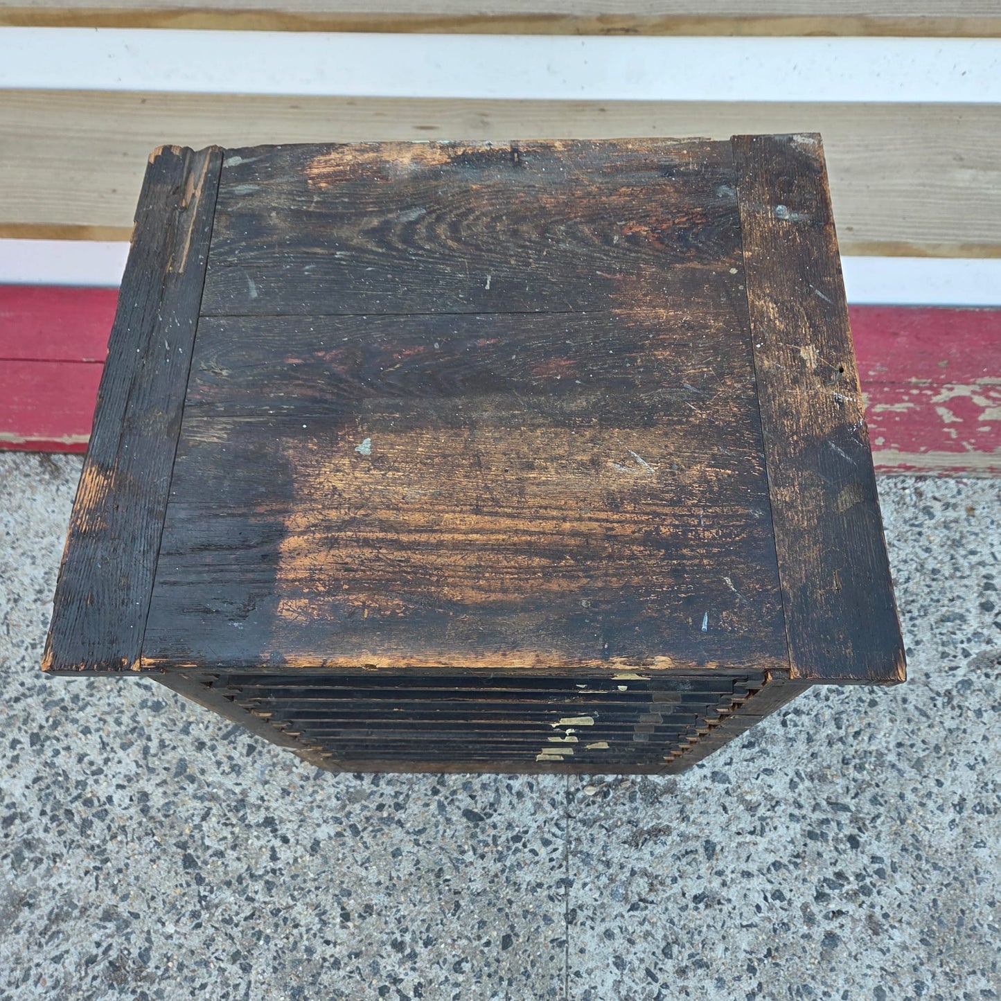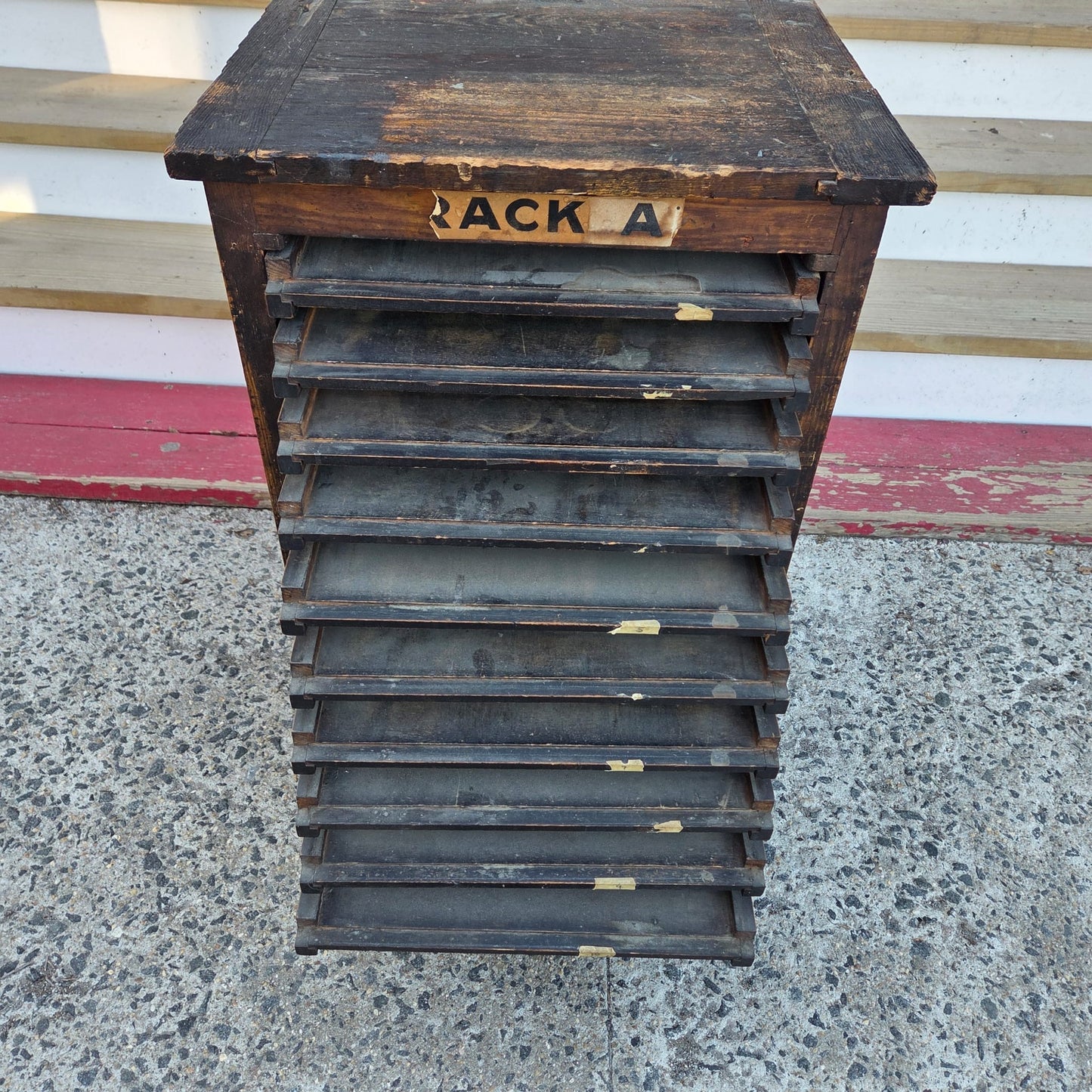 A rare find straight from an American print shop. This solid wood galley rack — labeled “Rack A” — retains all 12 original sliding trays, deep ink patina, and a worn label that reads like a design detail in itself.The flat top, paneled side, and dark-stained hardwood give it an effortlessly industrial presence. Use the trays as-is for art prints, maps, or blueprints — or style the open face as a display piece!