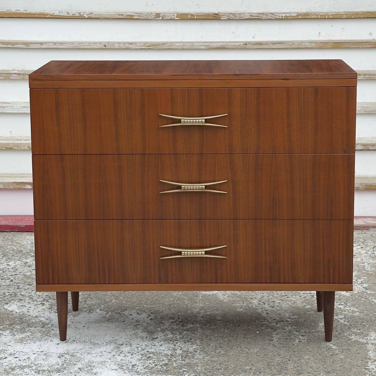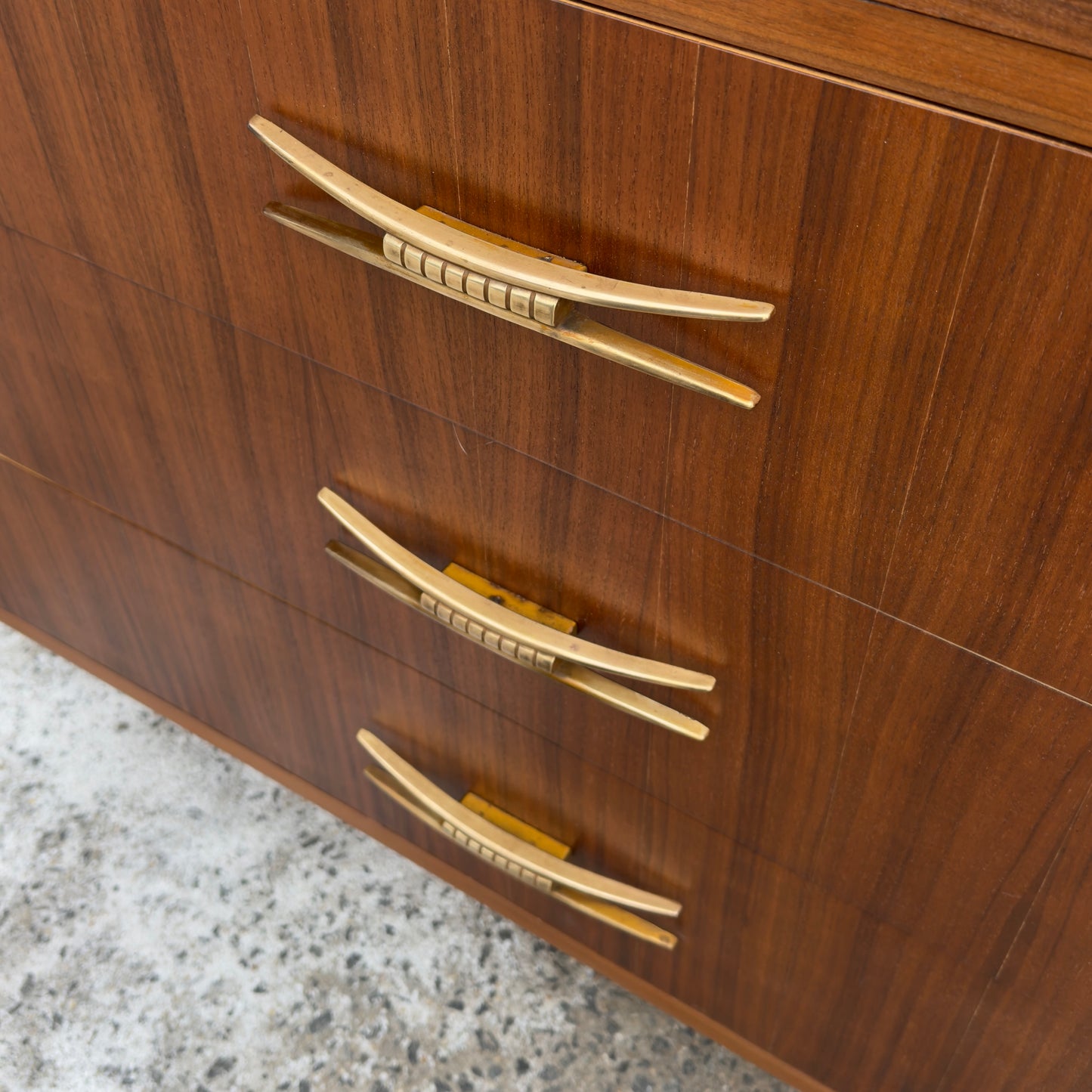 Vintage MCM chest designed by Johnson Carpet. Grain matched walnut on the front with fab original hardware!